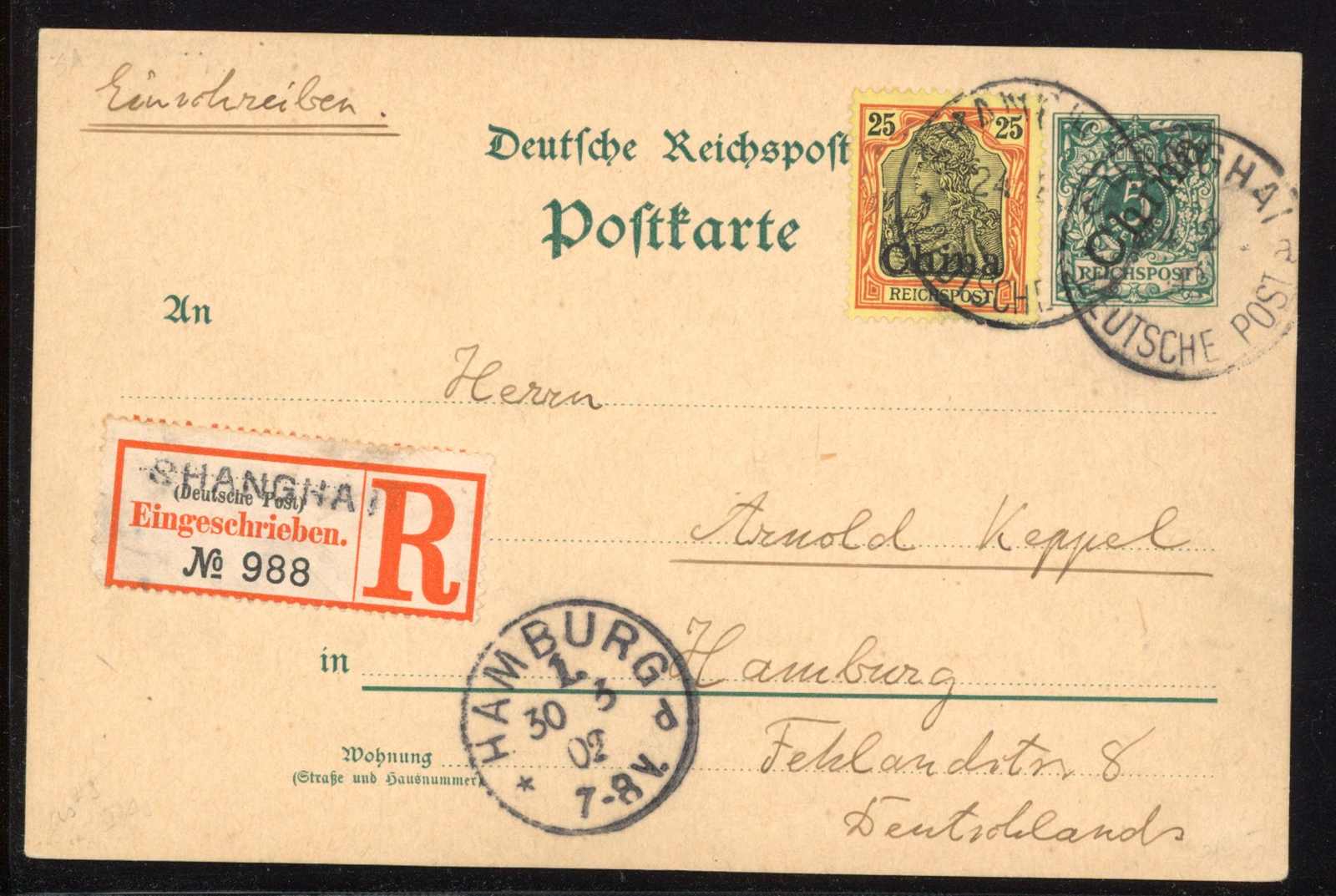 1902, 5 Pfg. Ganzsachen-Postkarte mit steilem Aufdruck "China" und Zusatzfrankatur 25 Pfg. Germania mit waagerechtem Aufdruck "China", tarifgerechte Frankatur als Einschreibkarte, aufgegeben "SHANGHAI DEUTSCHE POST 24/2 02", adressiert