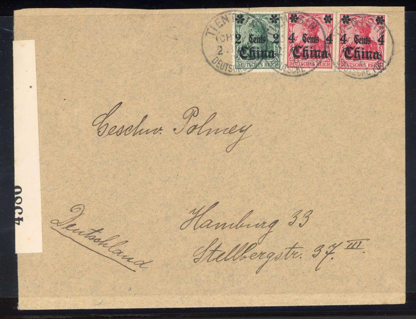 1916, Kriegspost, "TIENTSIN CHINA DEUTSCHE POST 2.11.16", 3 Abschläge auf Auslandsbrief nach Hamburg adressiert, durch britische Behörden zensiert und links mit üblichem Verschlussstreifen "OPENED BY CENSOR 4586" wieder verschlossen, die