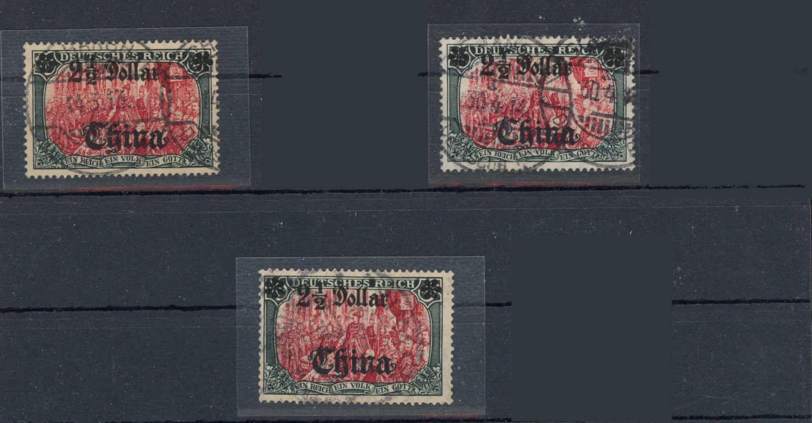 1906, 2½ D. auf 5 M. Germania, 3 sauber gest. Einzelwerte in den angegebenen Typen, farbfrisch und meist gut gezähnt, 47 I A2 b PF I mit Eckbug und Zahnunregelmäßigkeiten, sonst gute Qualität, alle geprüft Jäschke-Lantelme BPP (ME