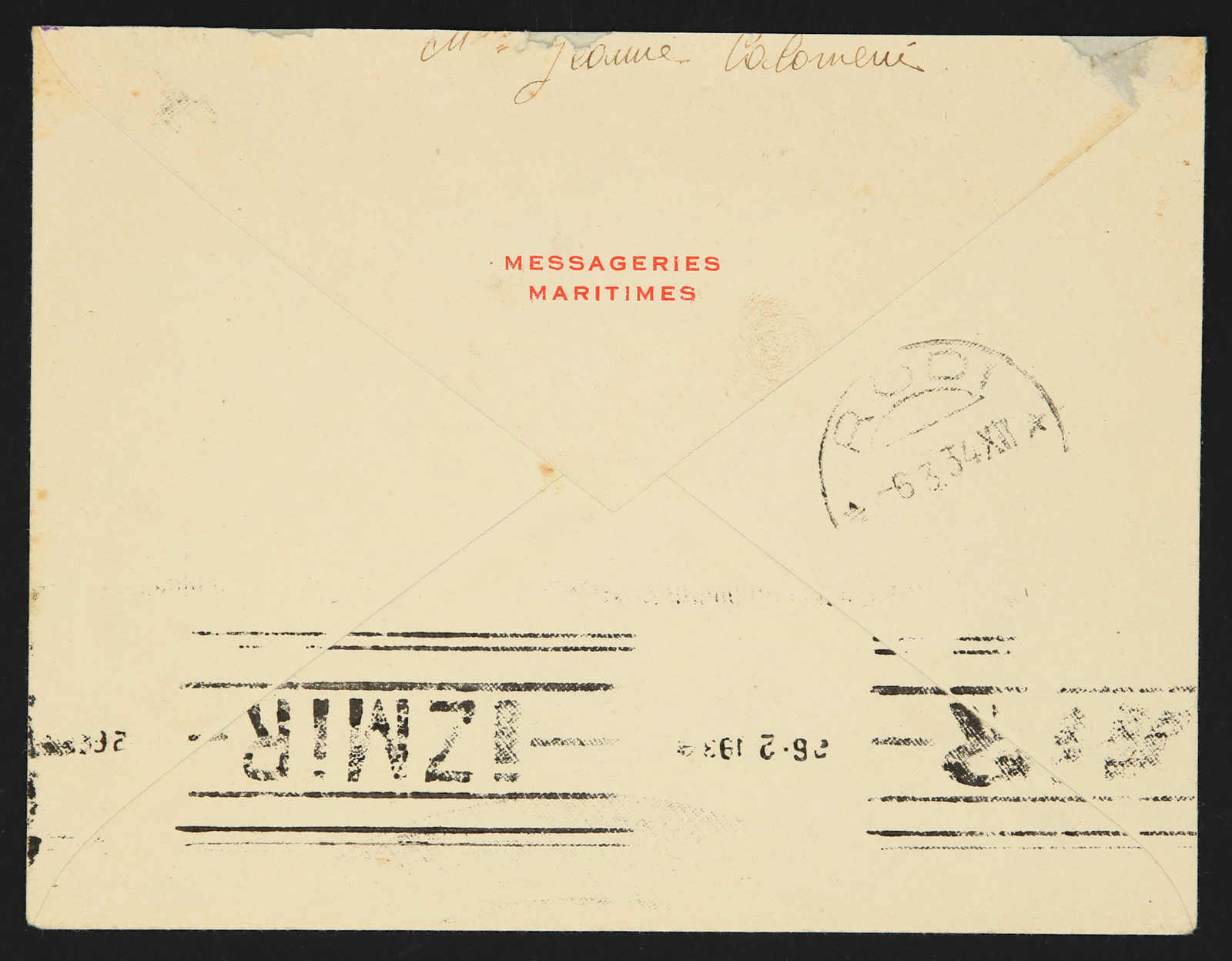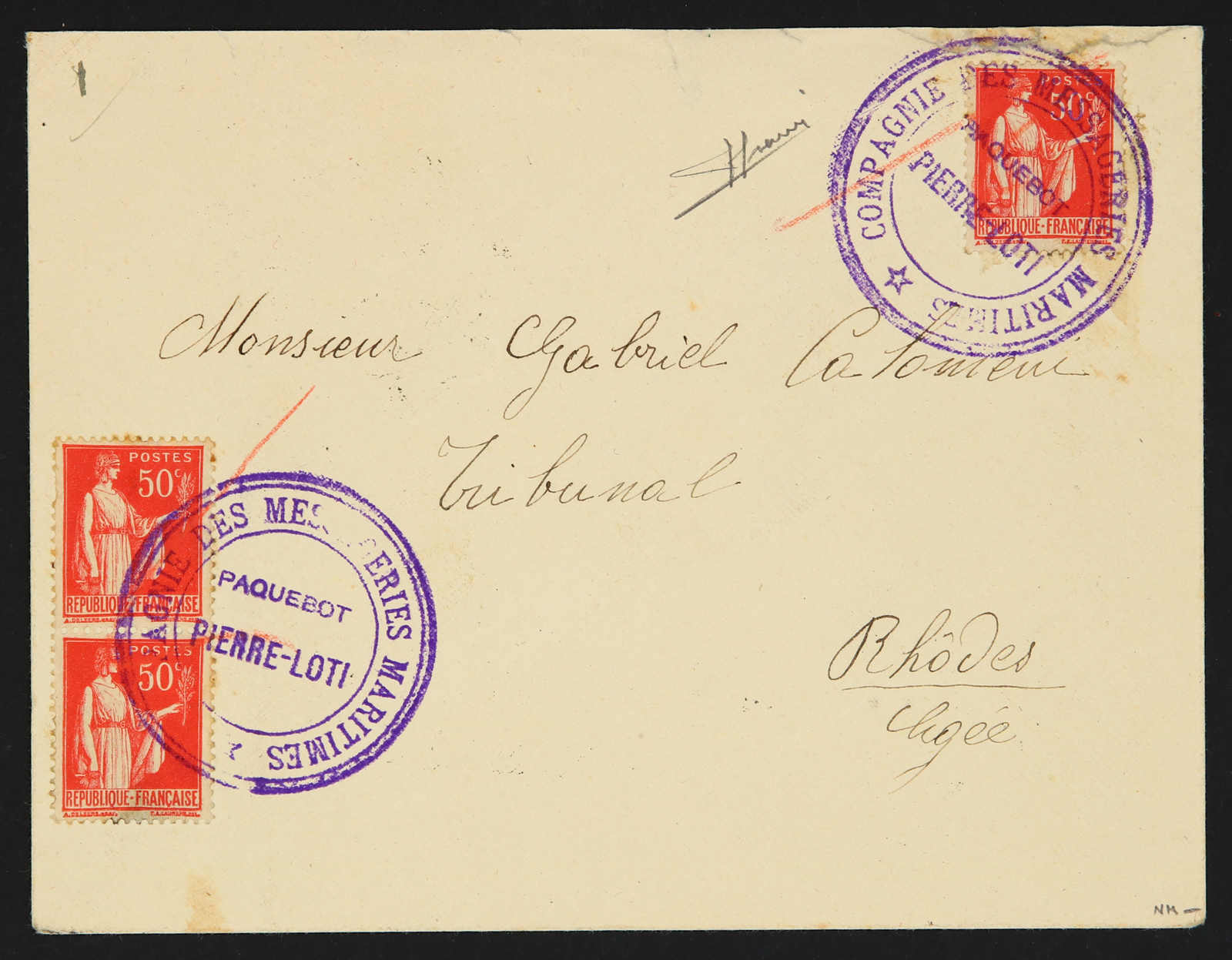 1934, cover sent to Rhodes island via İzmir/Turkey bearing 3x 50 cent, tied by very clear large blue "COMPAGNIE DES MESSAGERIES MARITIMES / PAQUEBOT - PIERRE-LOTTI" cachets, on reverse "İZMIR" transit and "RODI" arrival cds (Image) (imagea)