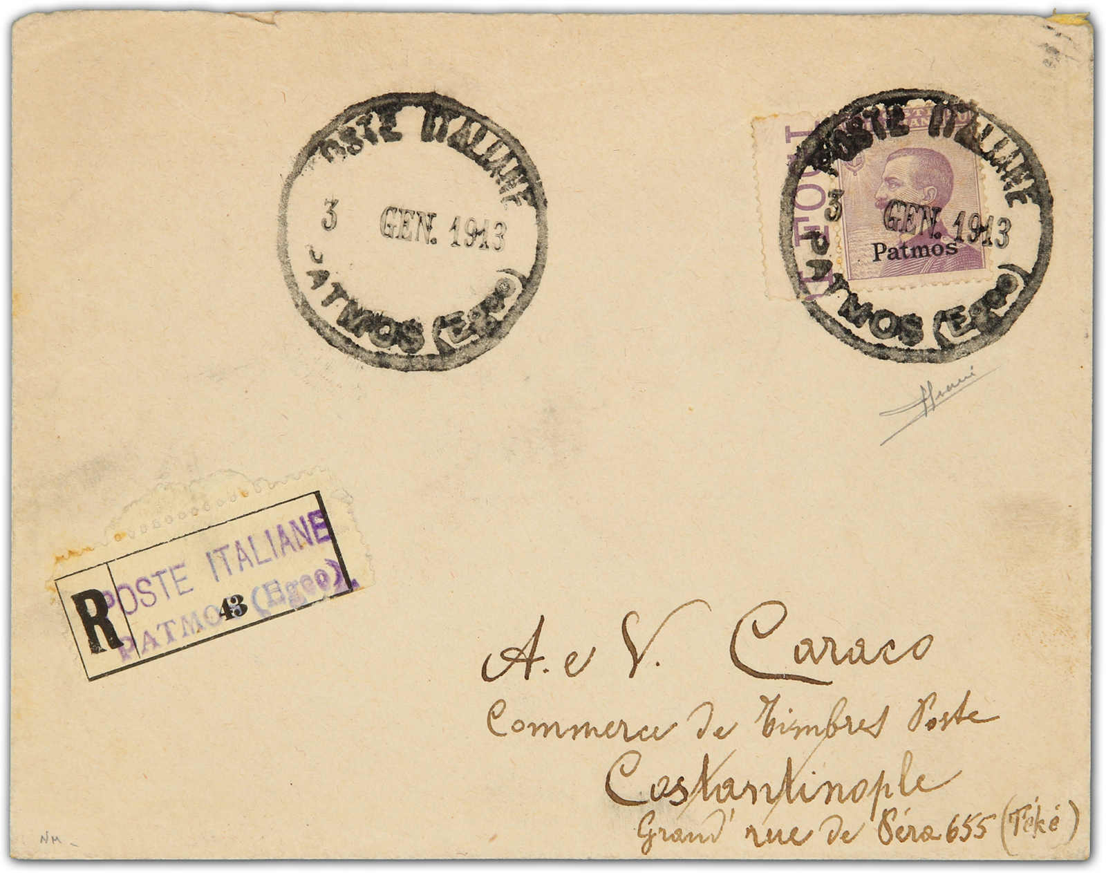 1913, single franking registered cover bearing 50 cent, "Patmos" overprinted tied by "POSTE ITALIANE PATMOS (Egeo)" postmark sent to Constantinople, alongside showing "R 43 POSTE ITALIANE PATMOS (EGEO)' registration label, on reverse