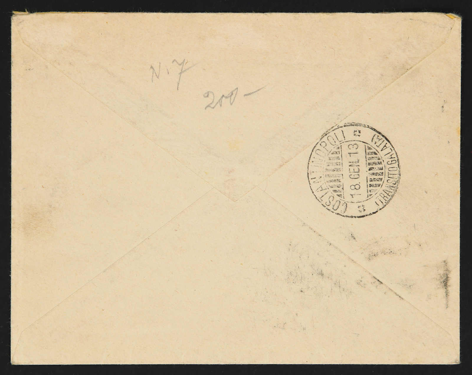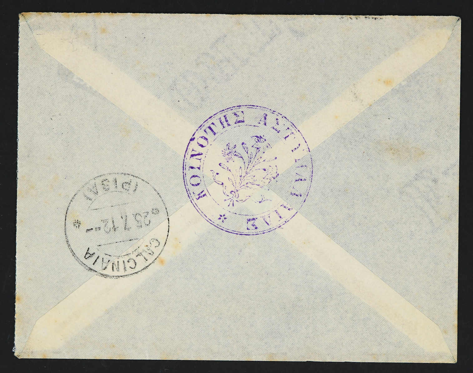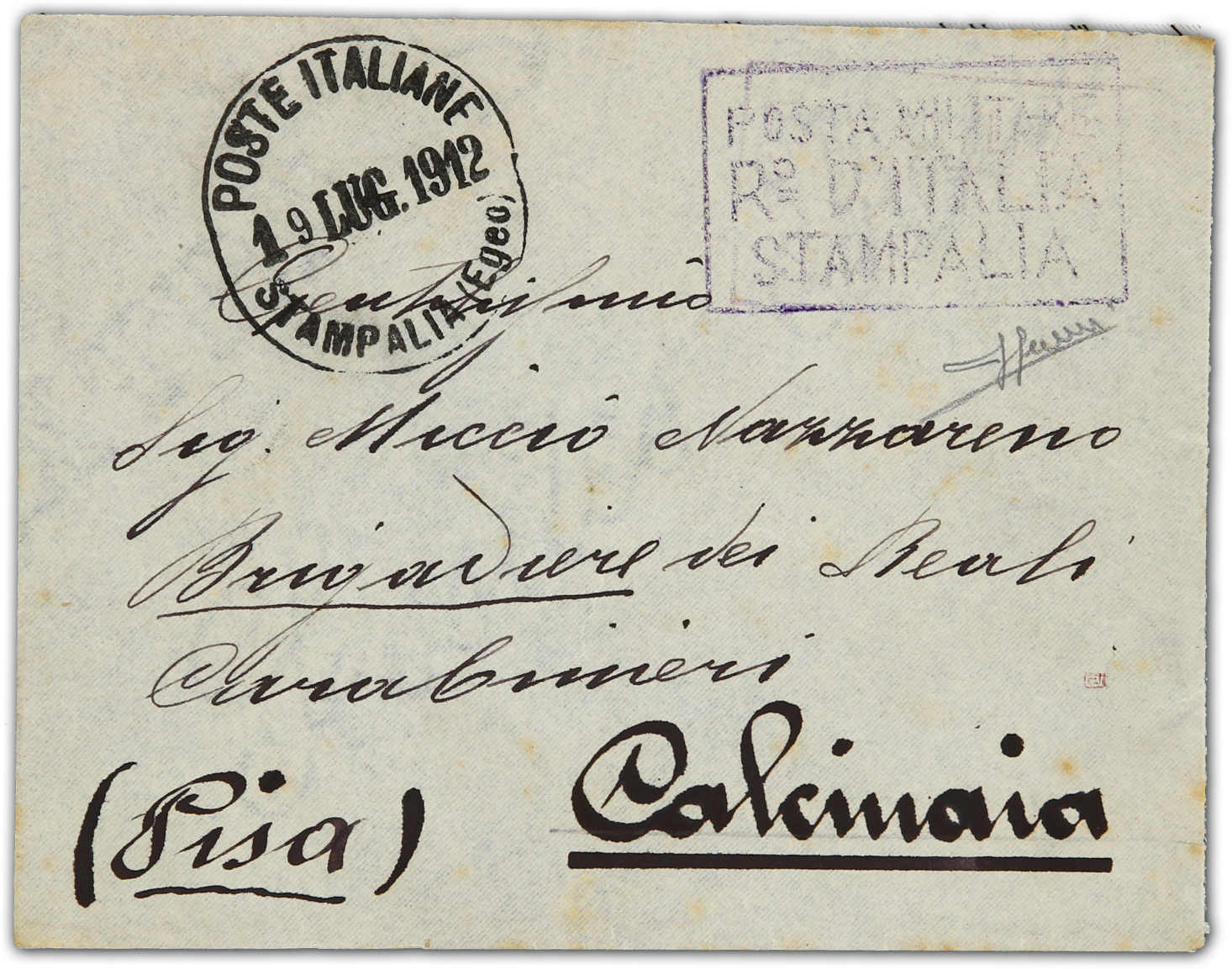 Stampalia, 1912, cover sent to Pisa/Italy showing "POSTE ITALIANE STAMPALIA (Egeo)" postmark and very rare large rectangle "POSTE MILITARE Ro. D'ITALIA STAMPALIA" post cachet (Tchilinghirian fig. 930), on reverse arrival cds, signed