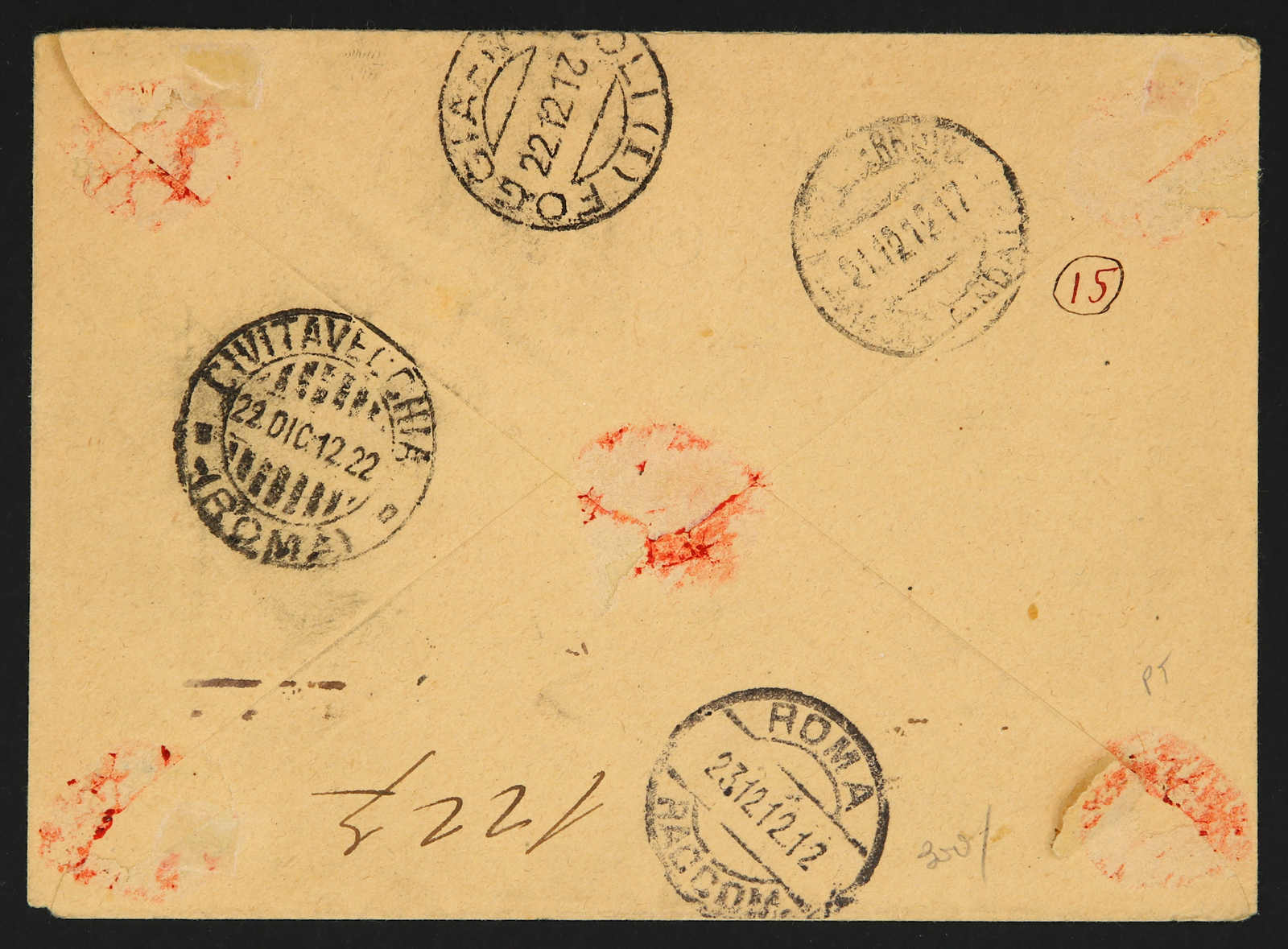 1912, declared value registered cover sent from Kalymnos to Roma/Italy bearing 2x 50 cent "EGEO" overprinted stamps tied by "KALYMNOS(Egeo)" postmarks, alongside very rare "A 147" registration label (Image) (imagea)