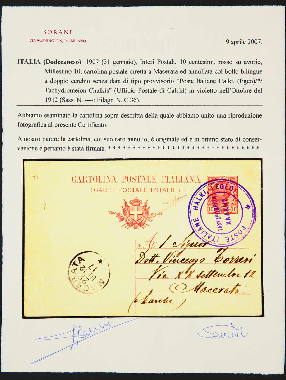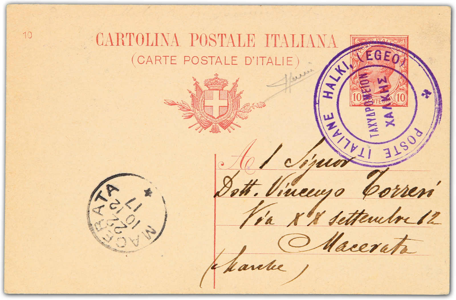 1912, Italian postal stationery card of 10 cent, sent from Halkı to Mecerata/Italy showing very rare and clear bilingual "POSTE ITALIANE HALKI (EGEO)" blue postmark, alongside arrival cds, certificate Sorani (Image) (imagea)