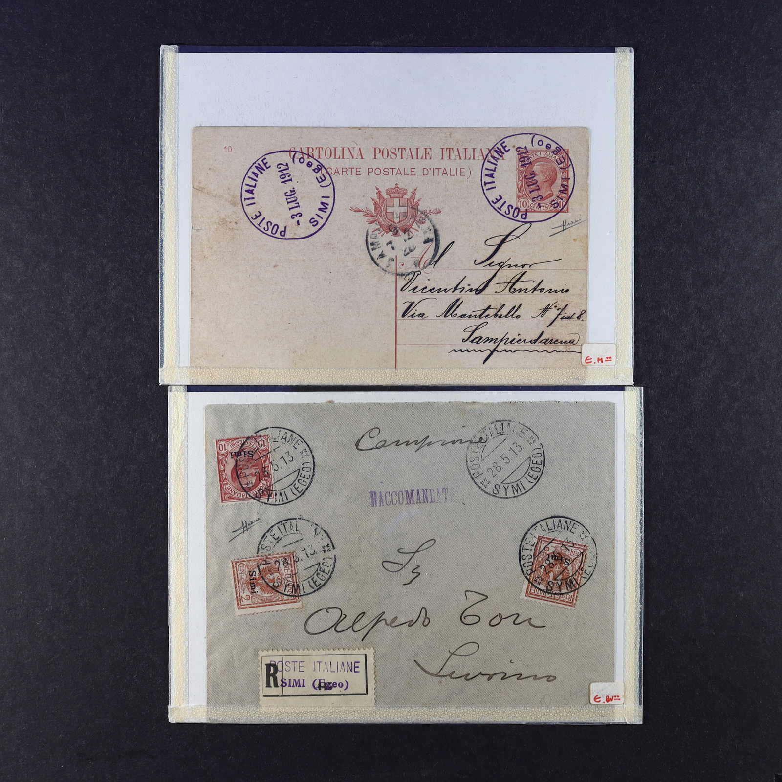 Simi Island, postal stationery card sent from Simi to Italy and registered cover bearing "Simi" overprinted stamps sent to Livorno (Image)