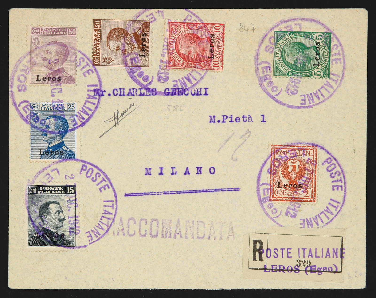 Leros, 1912, issue full set of 7 values on registered cover sent to Milano all tied by blue "POSTE ITALIANE LEROS (Egeo)" postmarks, signed Sorani (Sassone 220 €) (Image) (imagea)