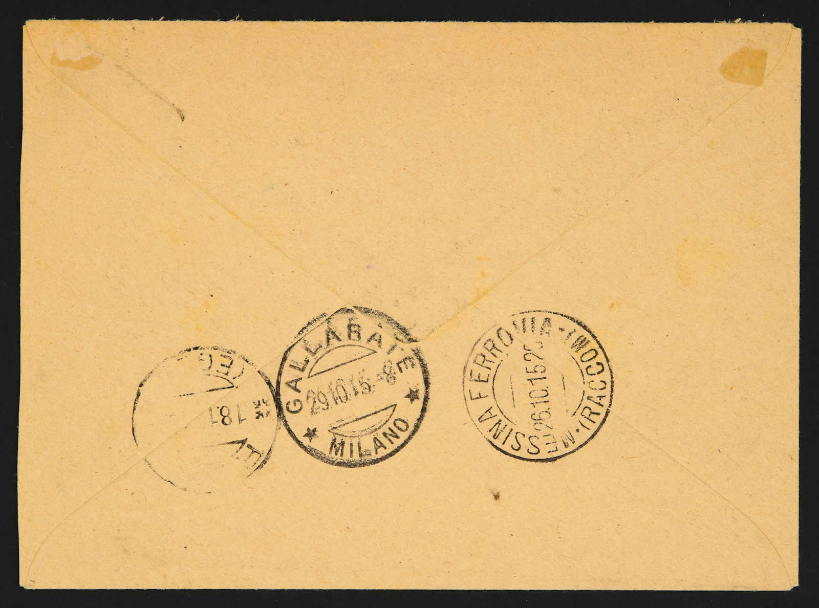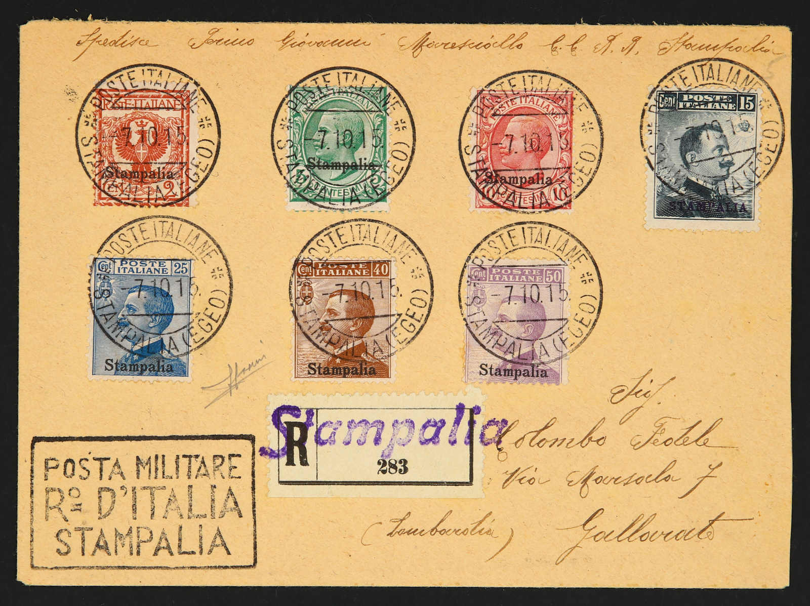 Stampalia, 1915, registered cover bearing Stampalia overprinted full set sent to Gallarate/Italy showing "POSTE ITALIANE STAMPALIA (EGEO)" postmark and very rare large rectangle "POSTE MILITARE Ro. D'ITALIA STAMPALIA" post cachet