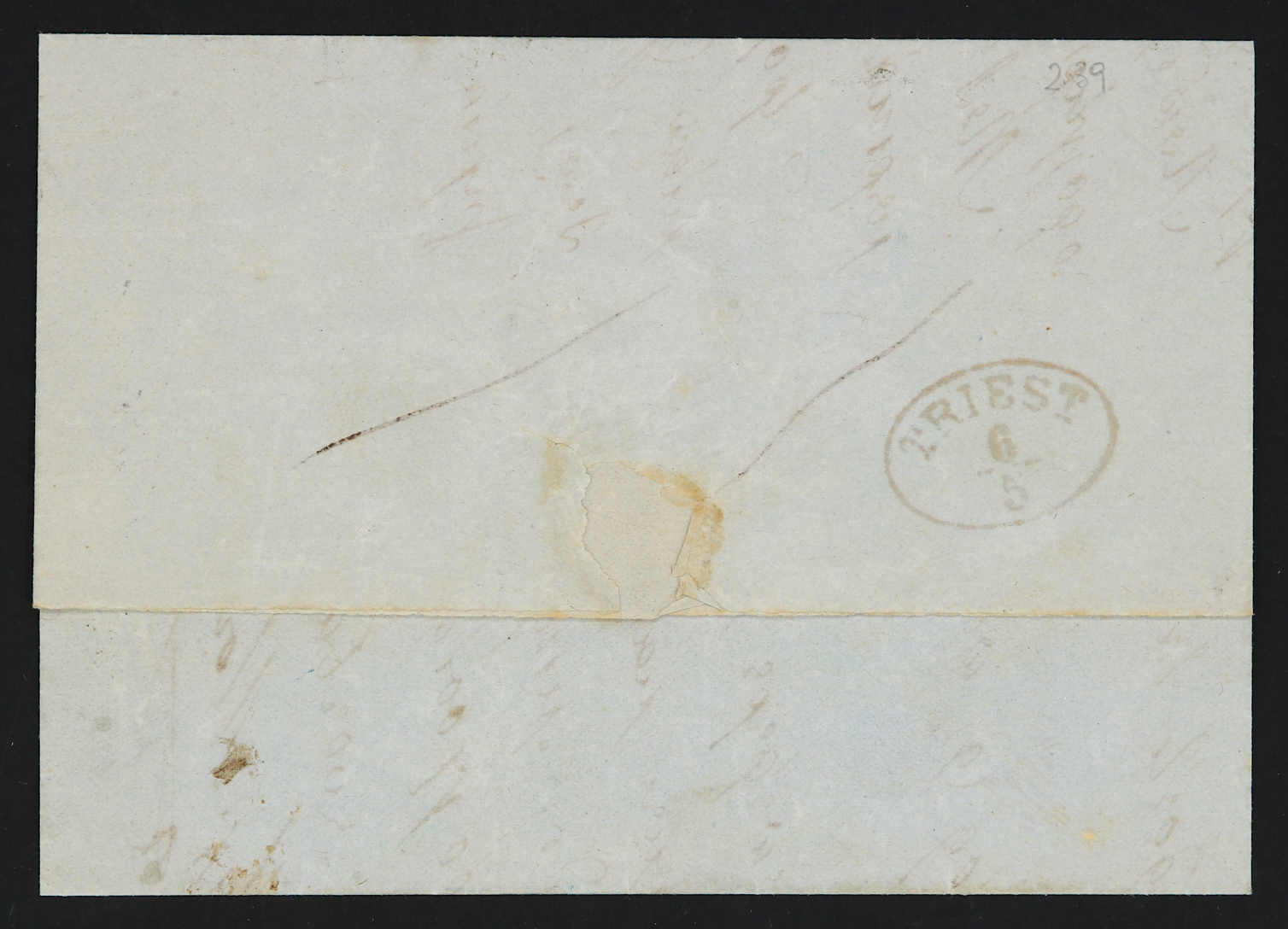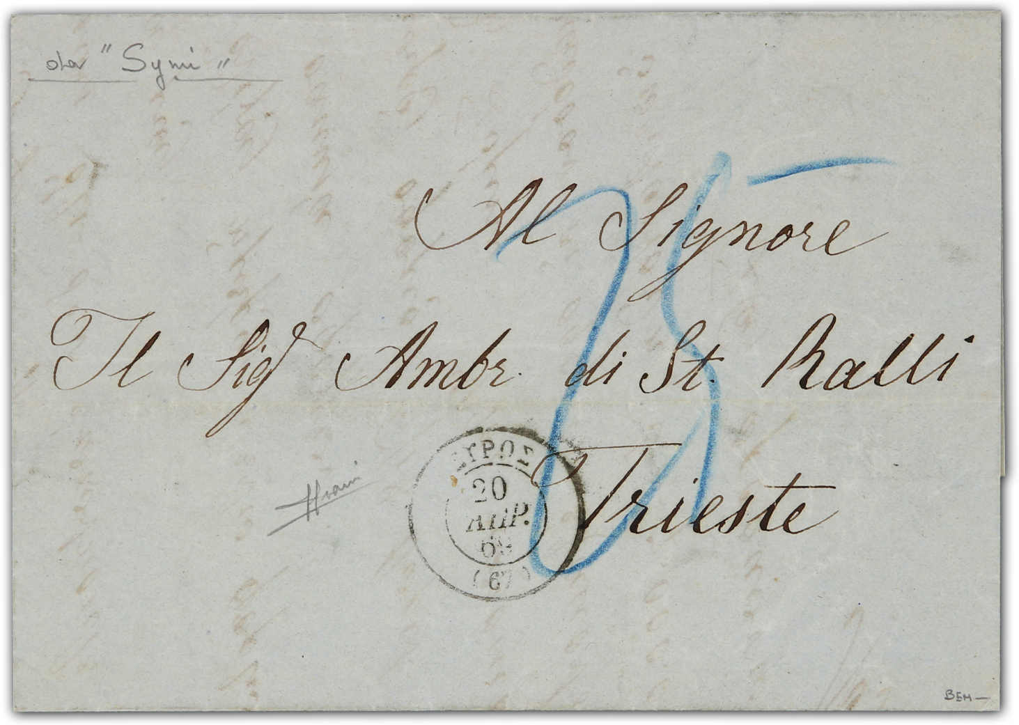 Symi Island Post office: 1869, entire letter sent from Symi to Triest via Syros Greek post office showing all Greek "Syros 20 Apr,69" cds, also 25 taxe by manuscript on front, on reverse showing Triest arrival cds, signed Sorani (Image) (imagea)
