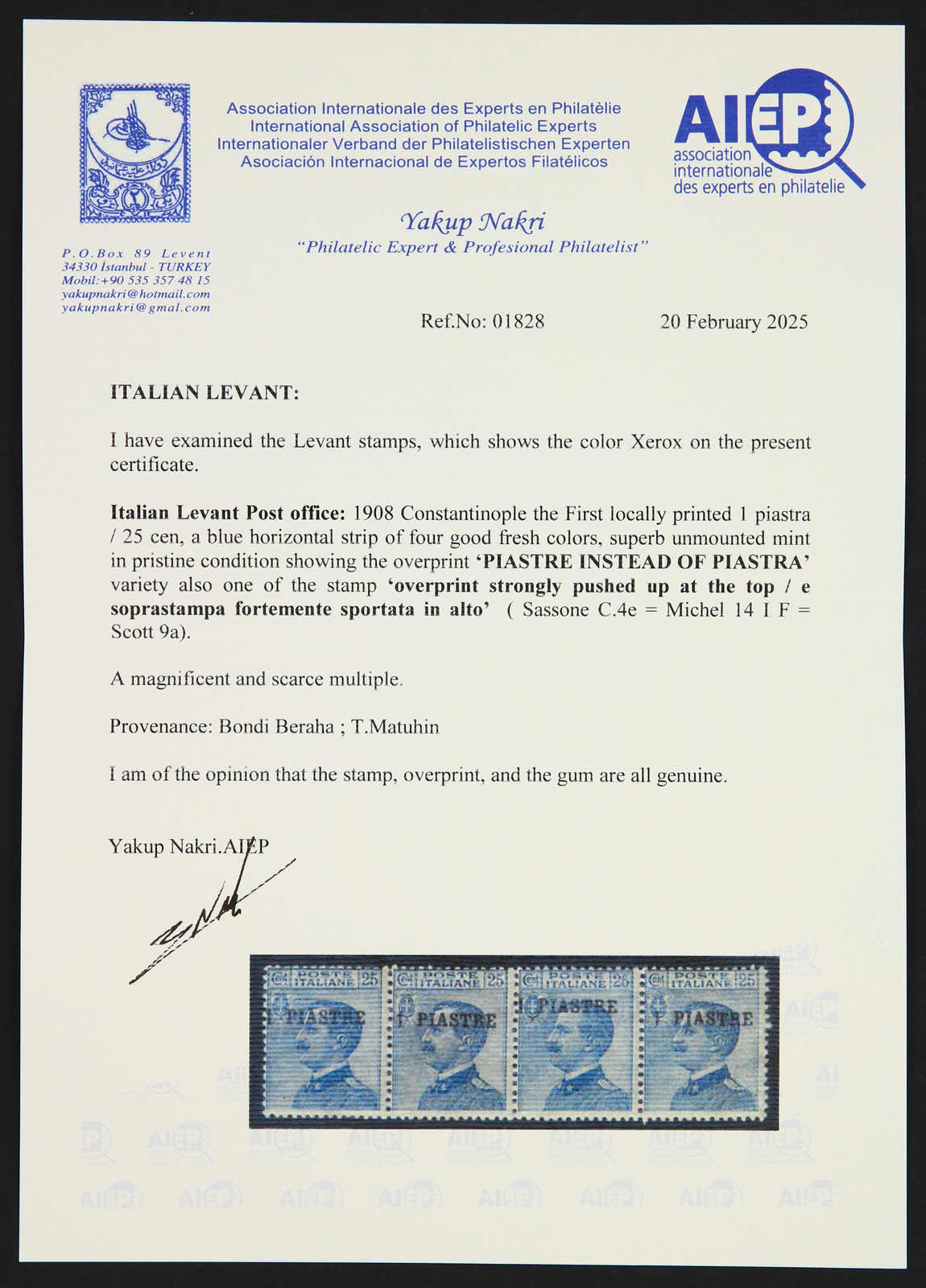 1908, Constantinople the first locally printed 1 piastra / 25 cen, a blue horizontal strip of four, good fresh colours, superb unmounted mint in pristine condition showing the overprint "PIASTRE INSTEAD OF PIASTRA" variety also one of the