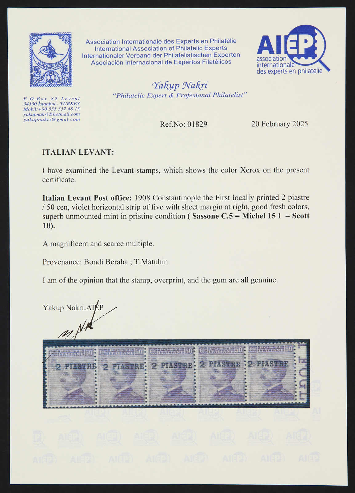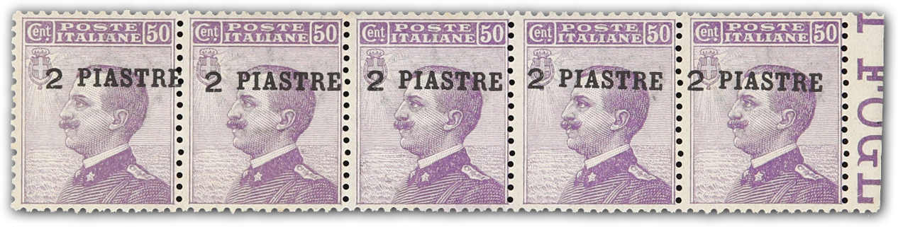 1908, Constantinople the First locally printed 2 piastre / 50 cen, violet horizontal strip of five with sheet margin at right, good fresh colors, superb unmounted mint in pristine condition (Sassone C.5 = Scott 10), amagnificent and