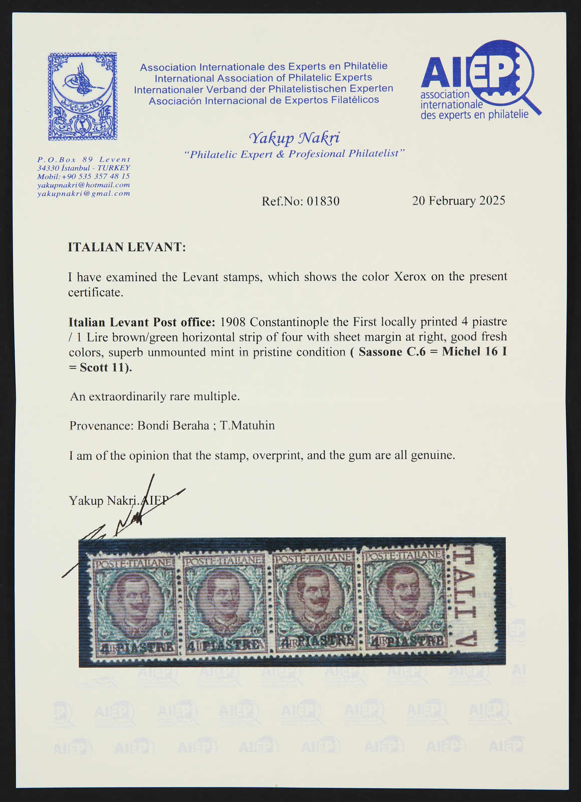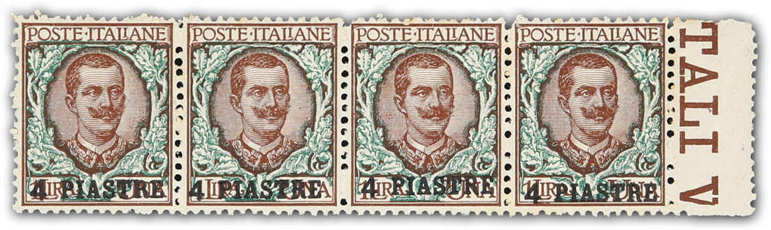 1908, Constantinople the First locally printed 4 piastre / 1 Lire brown/green horizontal strip of four with sheet margin at right, good fresh colors, superb unmounted mint in pristine condition (Sassone C.6 = Scott 11), a magnificent and