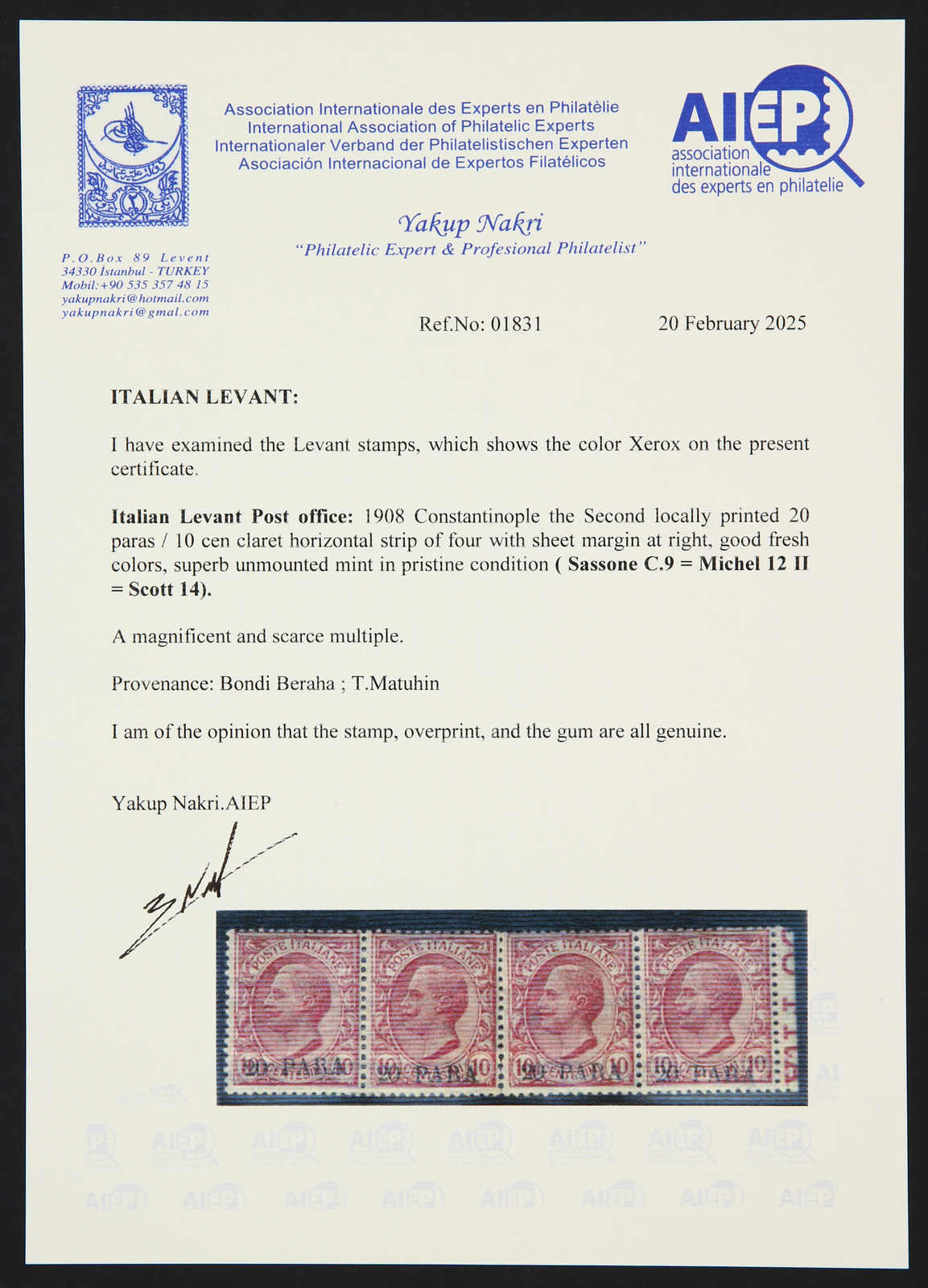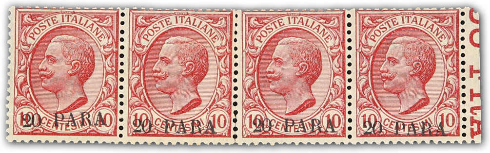 1908, Constantinople the Second locally printed 20 paras / 10 cen claret horizontal strip of four with sheet margin at right, good fresh colors, superb unmounted mint in pristine condition (Sassone C.9 = Scott 14), a magnificent multiple,