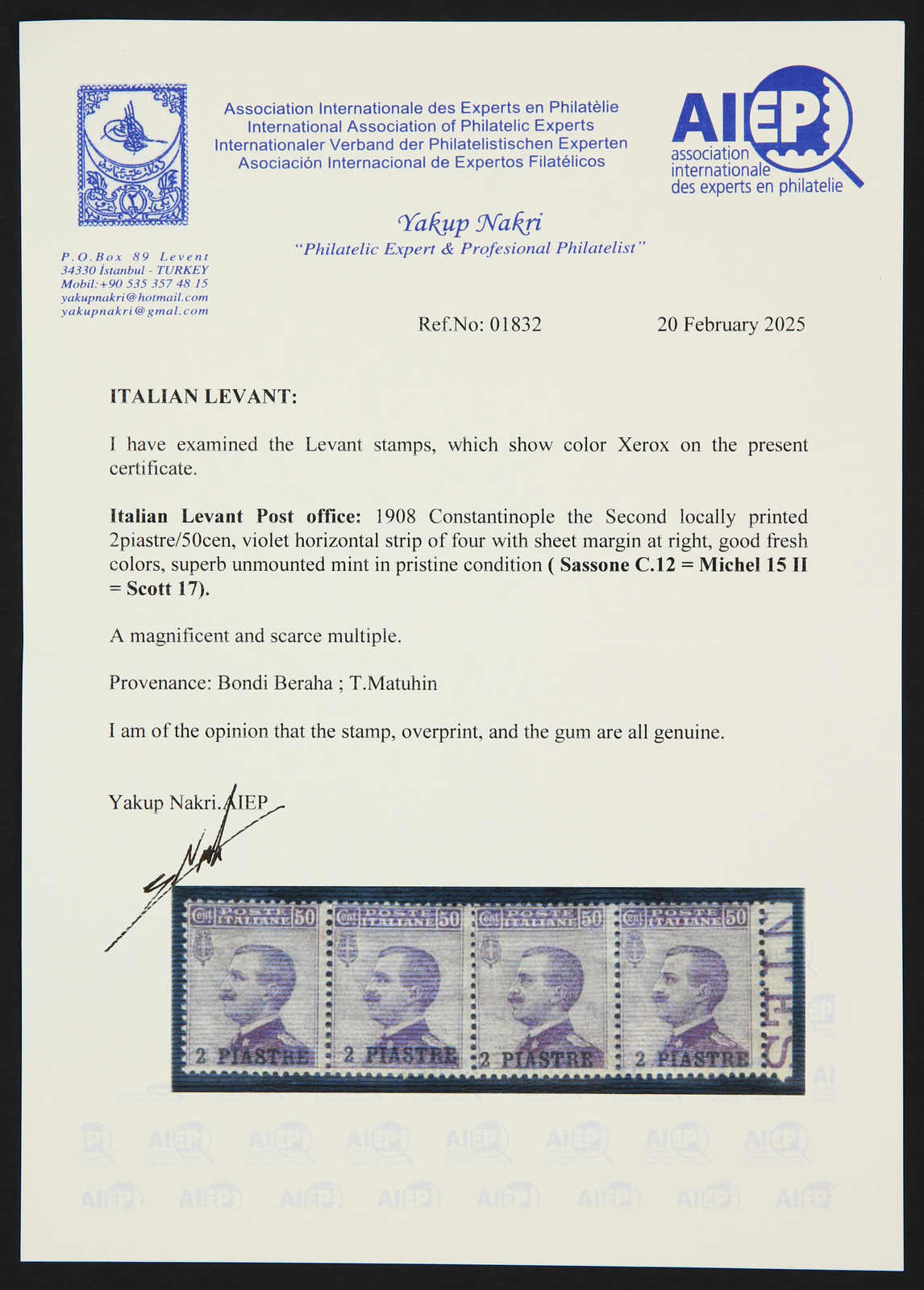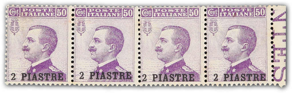 1908, Constantinople the Second locally printed 2 piastre / 50 cen. violet horizontal strip of four with sheet margin at right, good fresh colors, superb unmounted mint in pristine condition (Sassone C.12 = Scott 17), a magnificent and