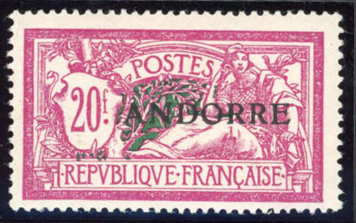 1931, 20 Fr. Freimarke mit Aufdruck "ANDORRE" ungebraucht, einwandfrei, sign. R. Blanc (ME ca. 320,-) (Image)
