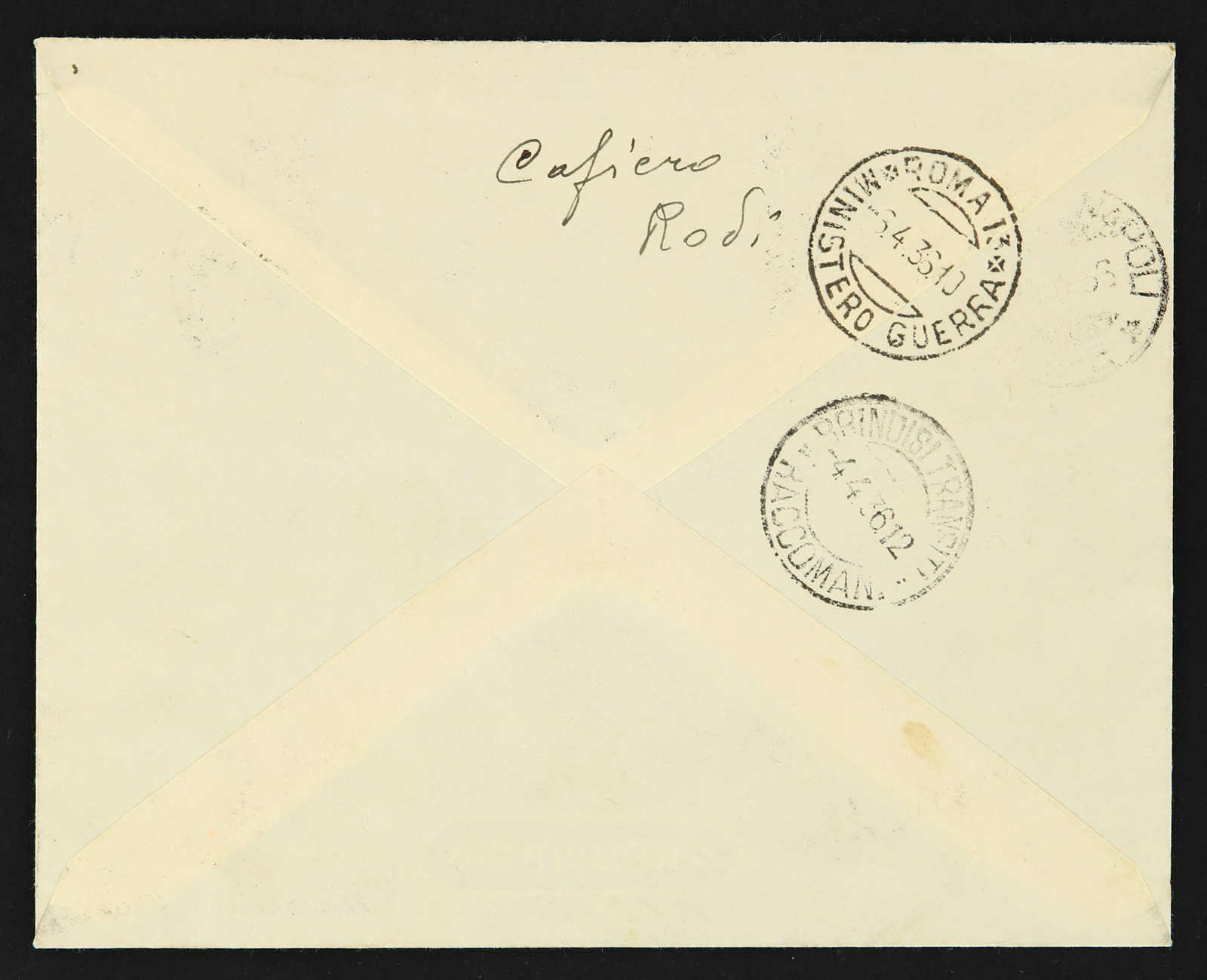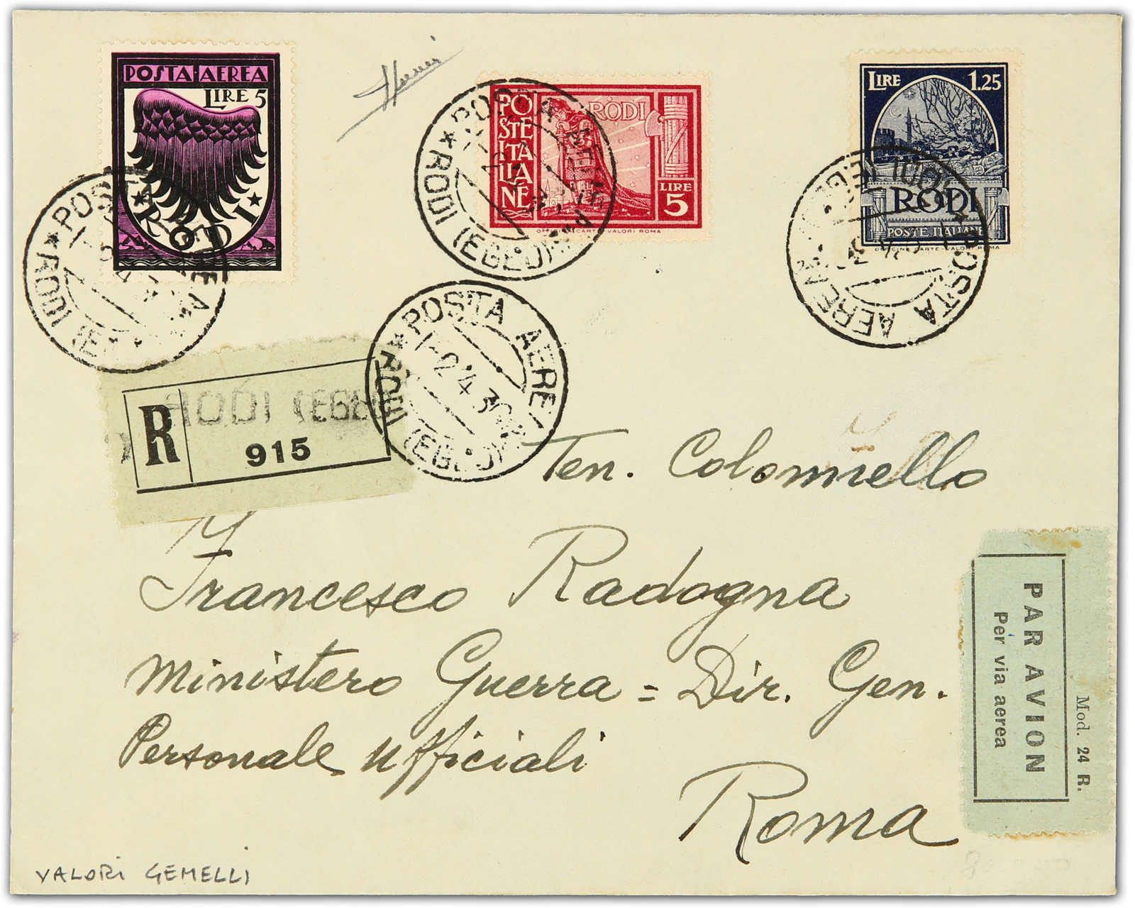 1936, registered cover bearing 5 Lire pictorial issue of 1932 issue and 5 lire of airmail issue of 1934 tied by Rodi Aerea postmarks sent to Roma with registration and "Par Avion" labels (Image) (imagea)