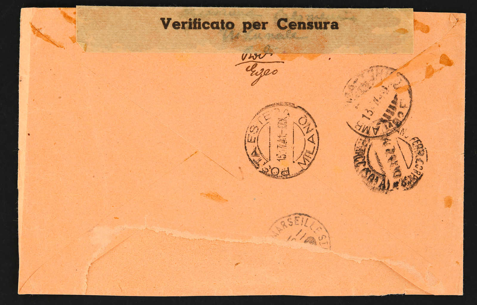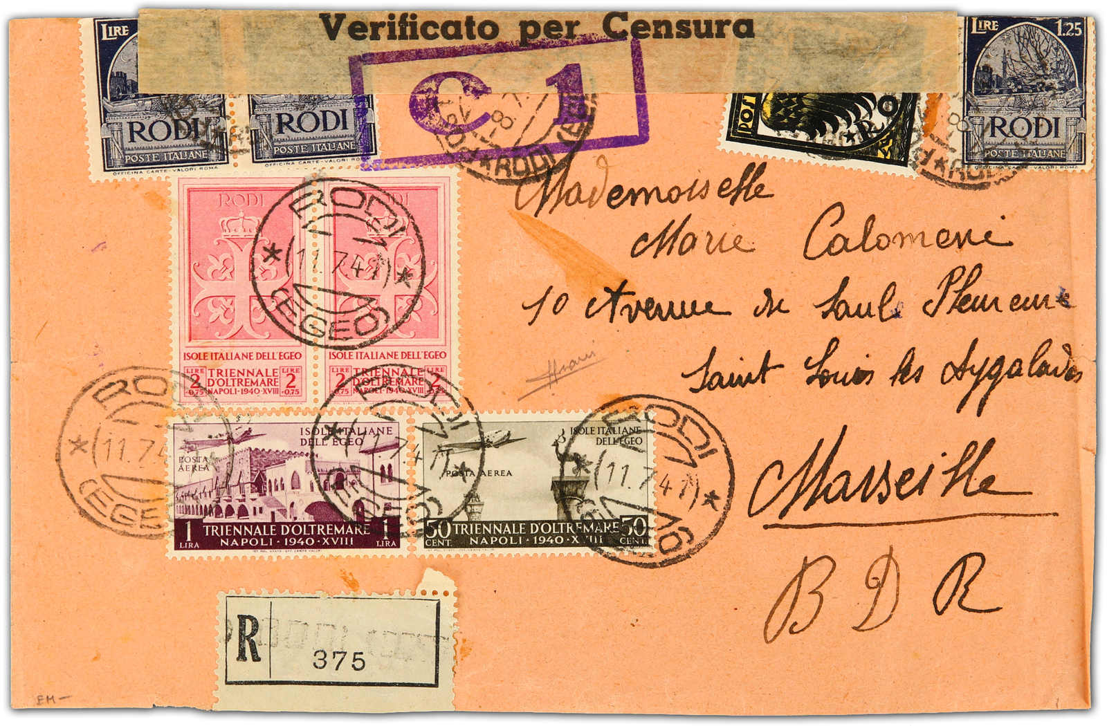 1941, registered cover sent from Rodi to Marseille / France bearing 1a Mostra Triennale d'Oltremare pair 2 Lire and 1 Lire airmail as well as 50 cent airmail stamps with censor label and cachets, signed Sorani (Image) (imagea)