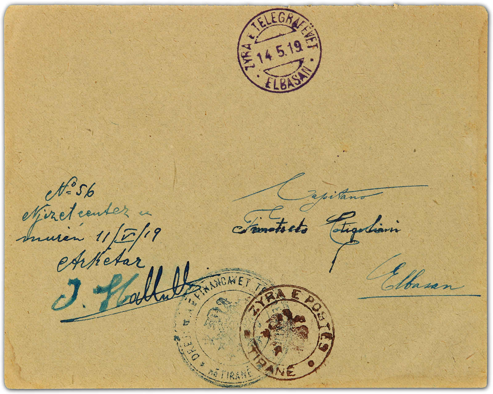 1919, local cover from Tirana sent to Elbasan showing "Zyra Postes / Tirana" and "Zyra e Telegrafevet / Elbasani" arrival postmarks (Image)