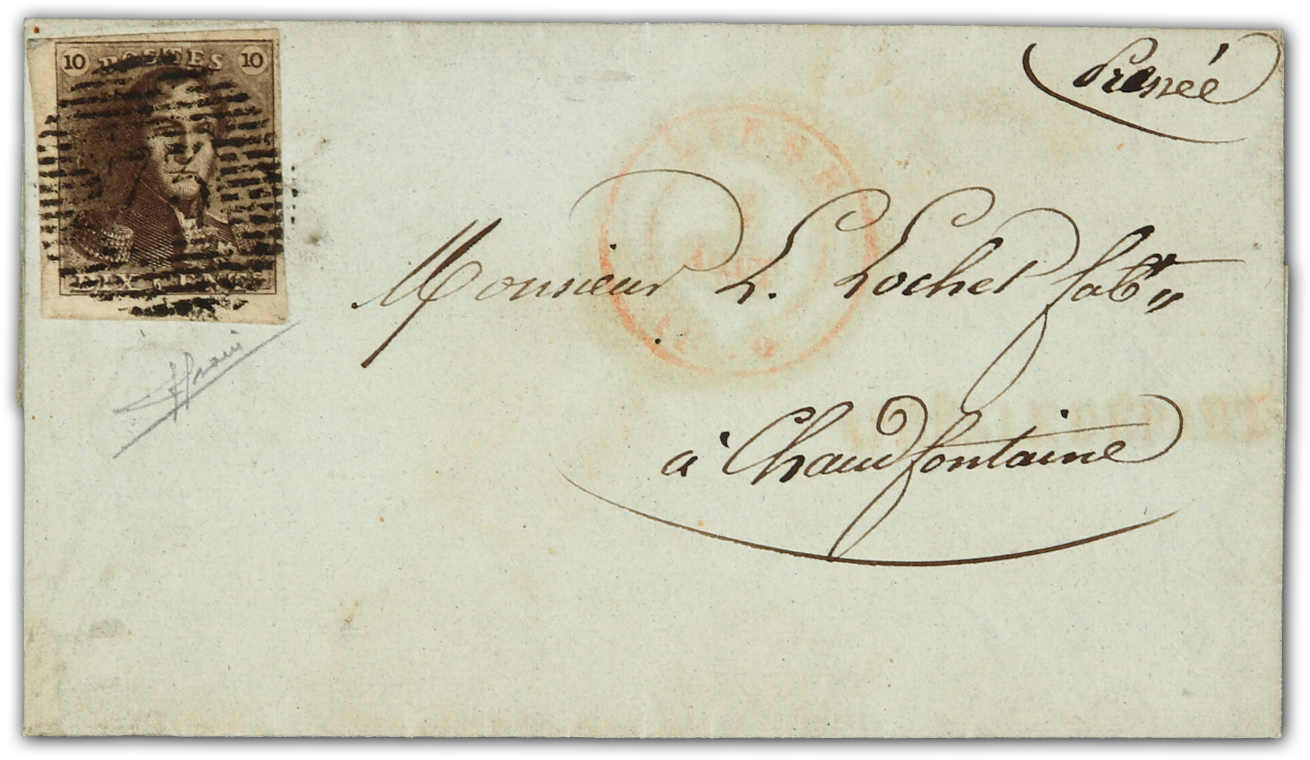 1849, 10 C. voll- bis breitrandig auf Faltbrief von Liege nach Chaudfontaine entwertet mit Nummernstempel "73" (Image)