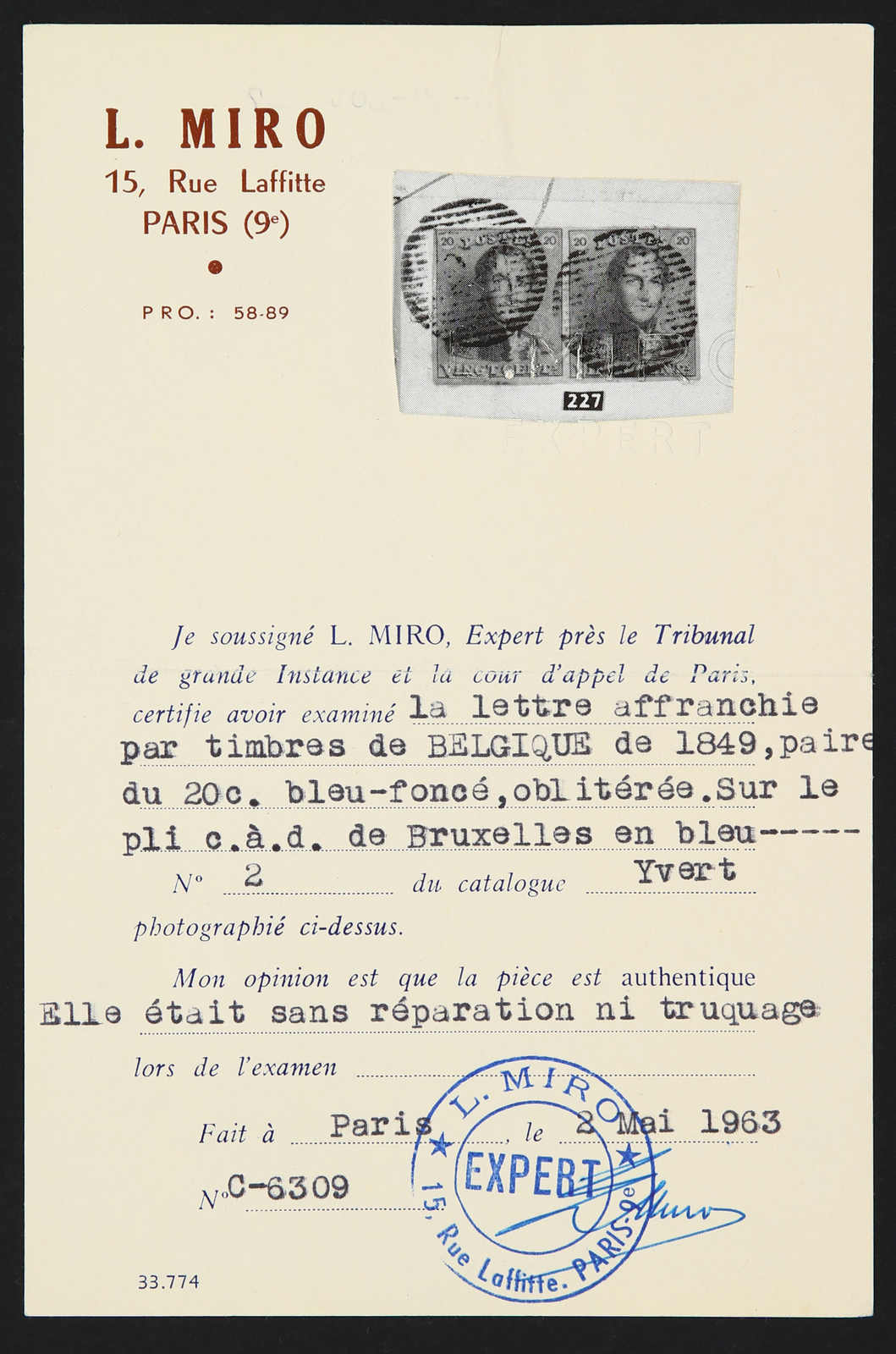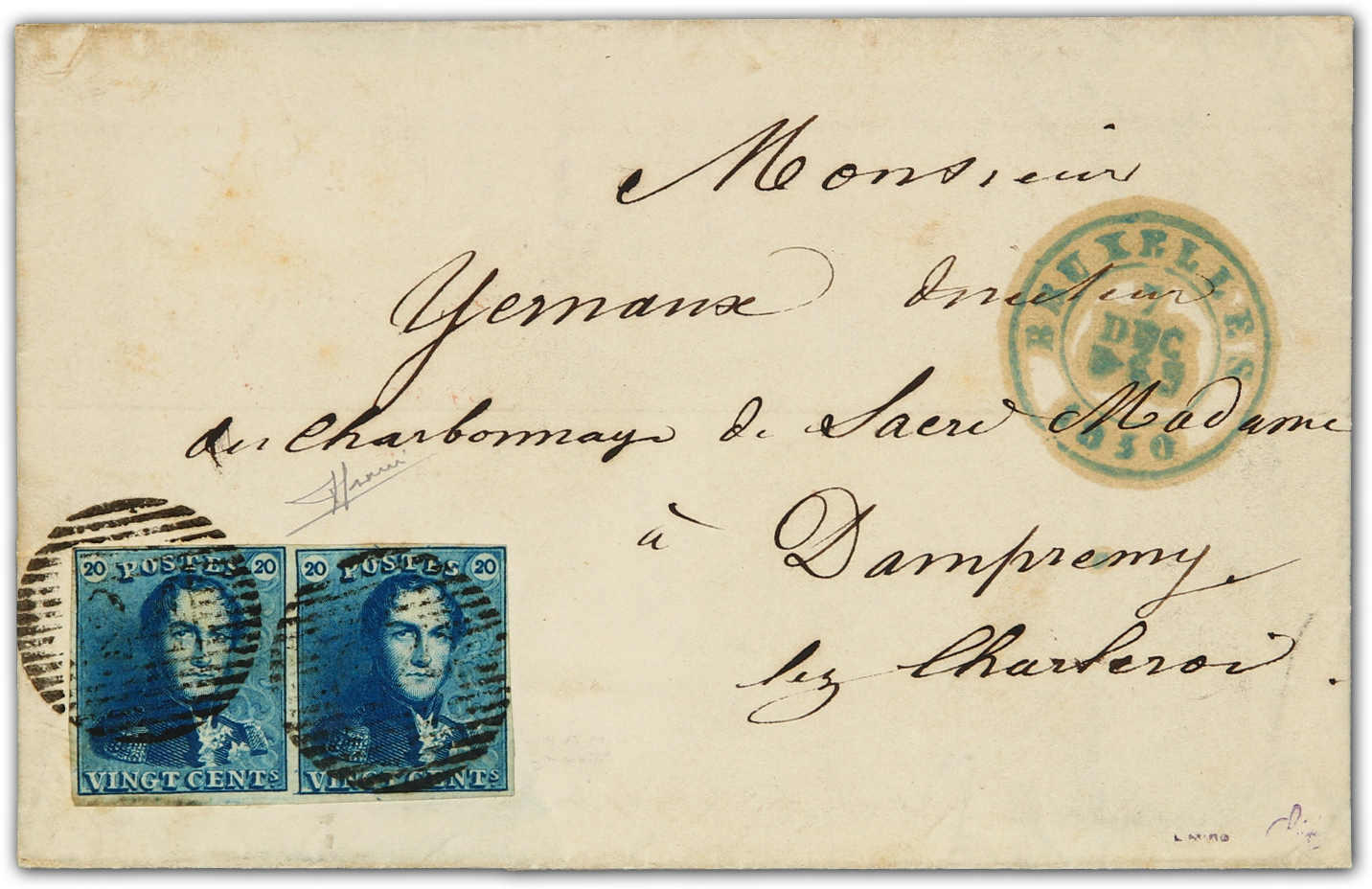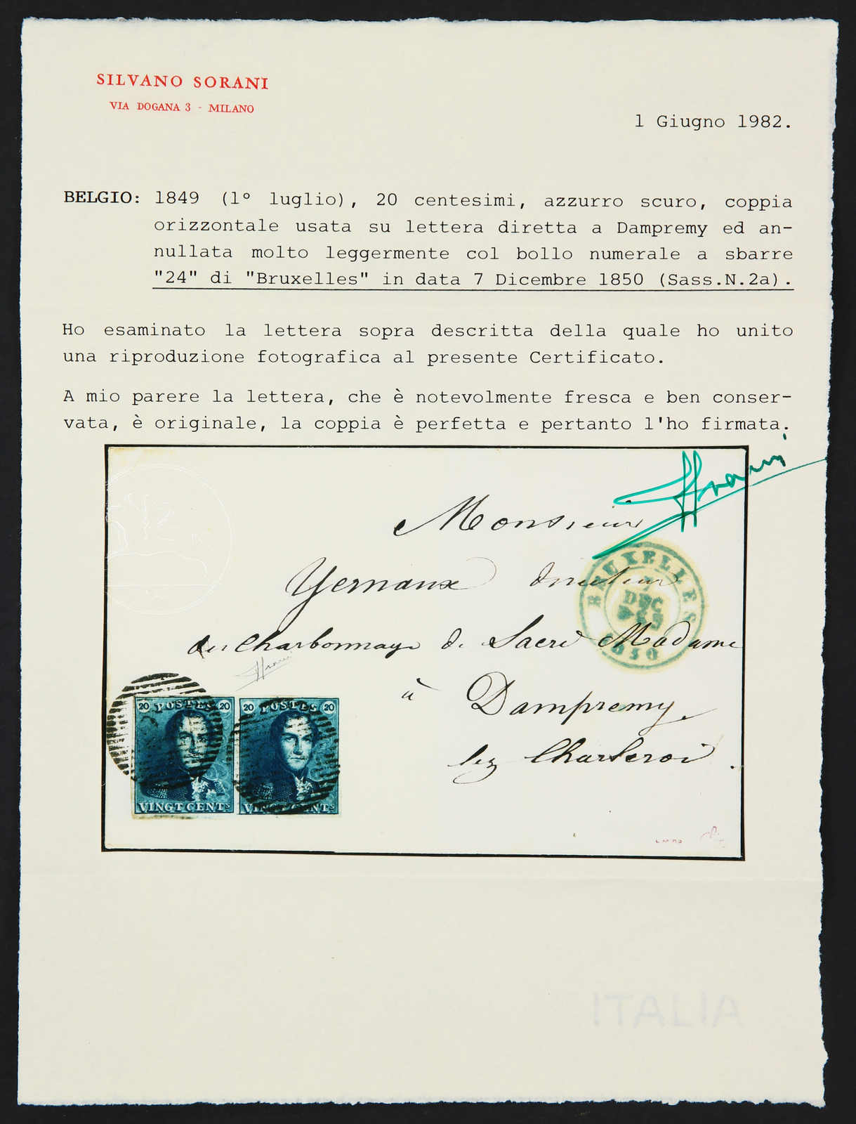 Faltbrief mit 20 C. dunkelblau im waagerechten Paar von Brüssel nach Dampremy entwertet durch Nummernstempel "24", Atteste L.Mira/Paris (1963) und S.Sorani