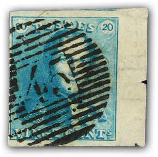 20 C. blau vom rechten Bogenrand, sauber gestempelt, oben Teil der Nachbarmarke erkennbar, dekorativ (Image)