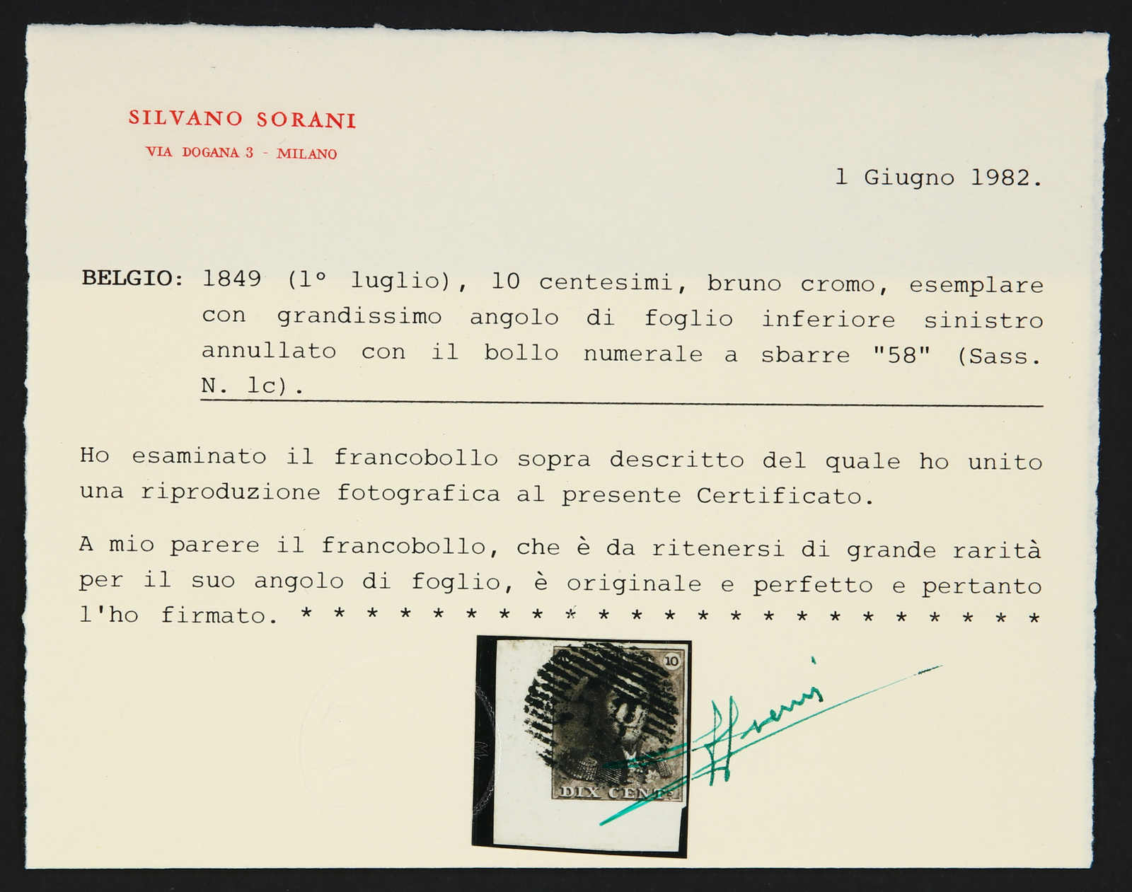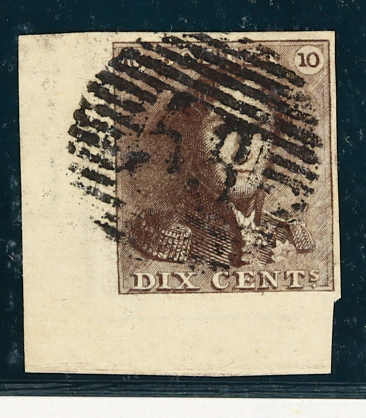 1849, 10 C. braun, Bogenecke unten links etwas ungewöhnlich geschnitten, entwertet durch Nummernstempel "58", einwandfrei, Attest Sorani