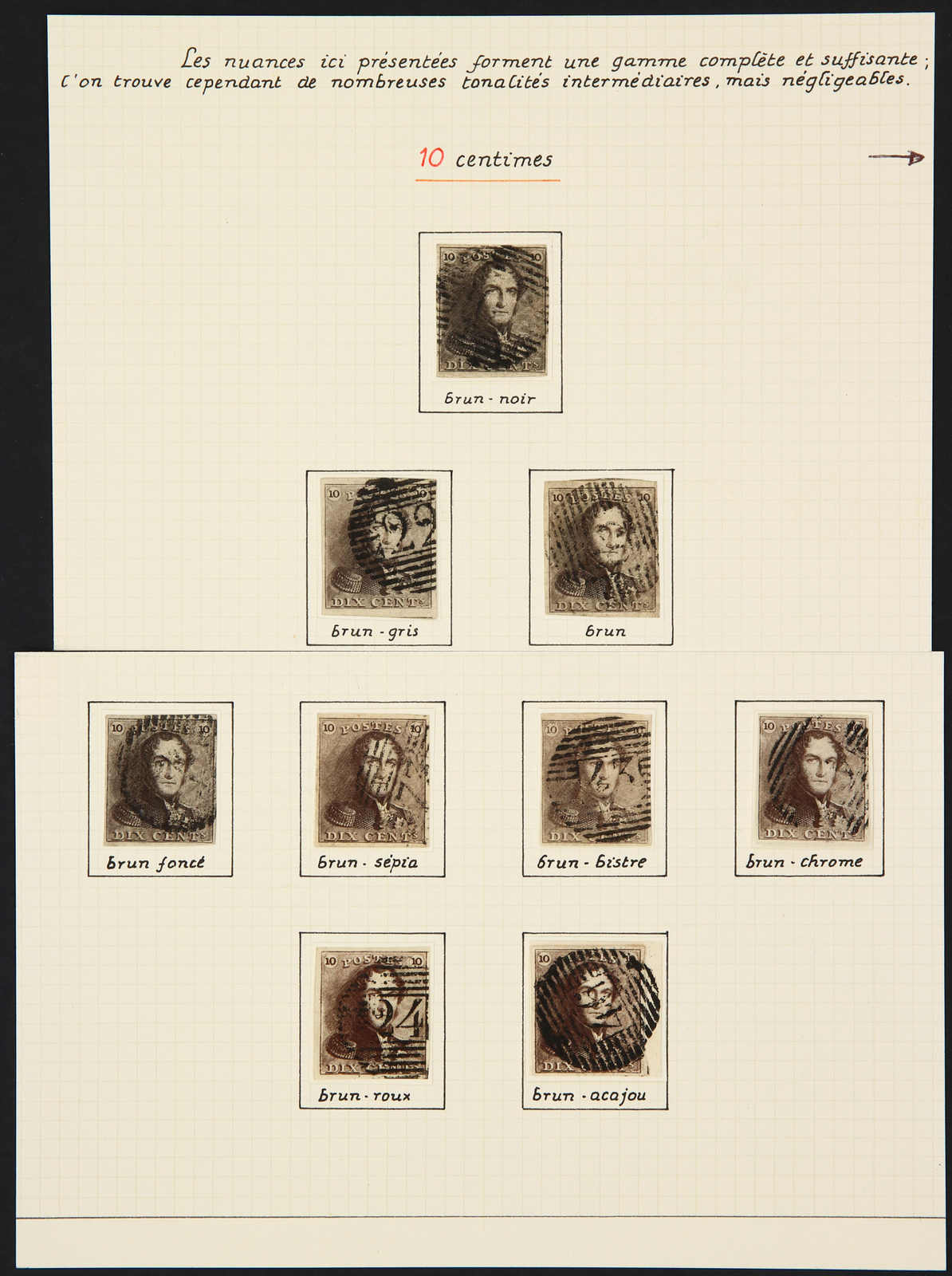 1849, 10 C. braun, neun sauber gestempelte Exemplare mit unterschiedlichen Entwertungen und Farbnuancen (Image)