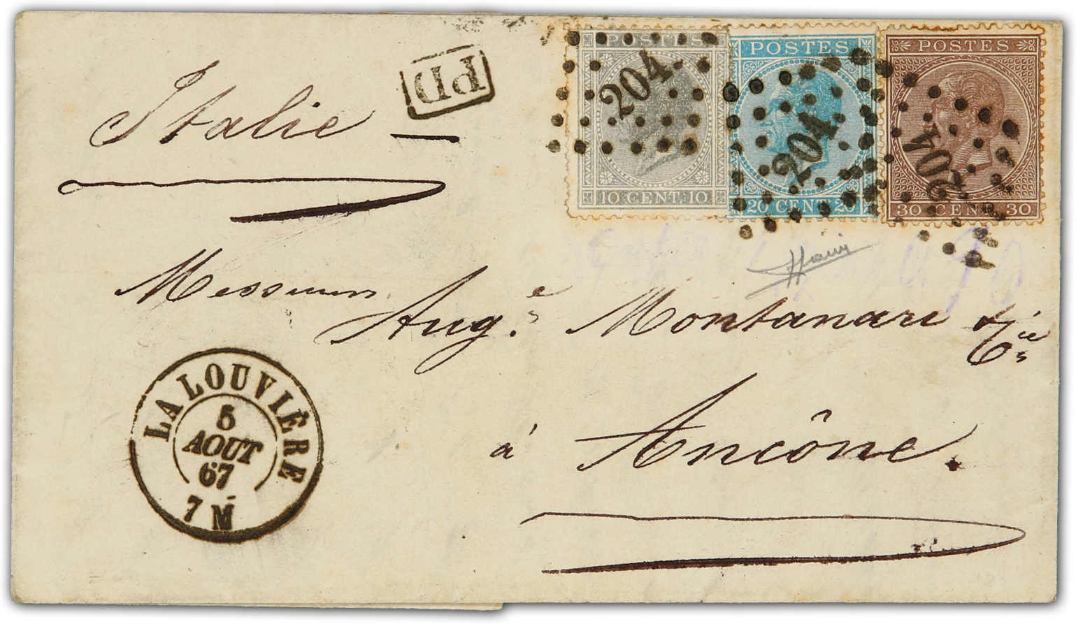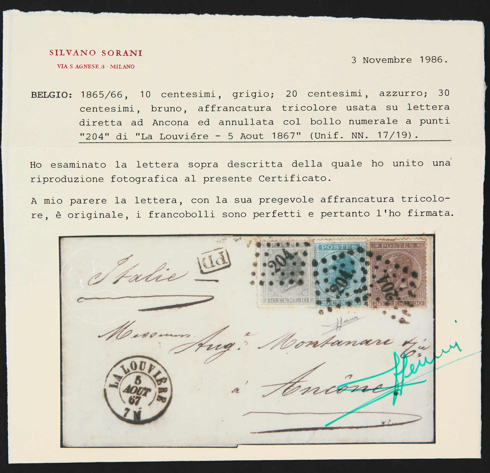 1867, Faltbrief von Lalouviere nach Ancona/Italien frankiert mit 10 C. grau, 20 C. blau und 30 C. braun entwertet durch Nummernpunktstempel "204", rückseitig Durchgangs- und Ankunftsstempel, Attest Sorani (Image) (imagea)