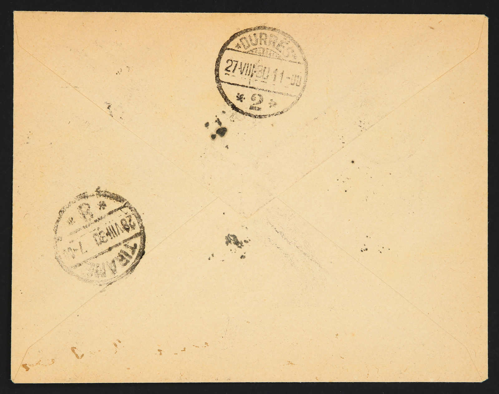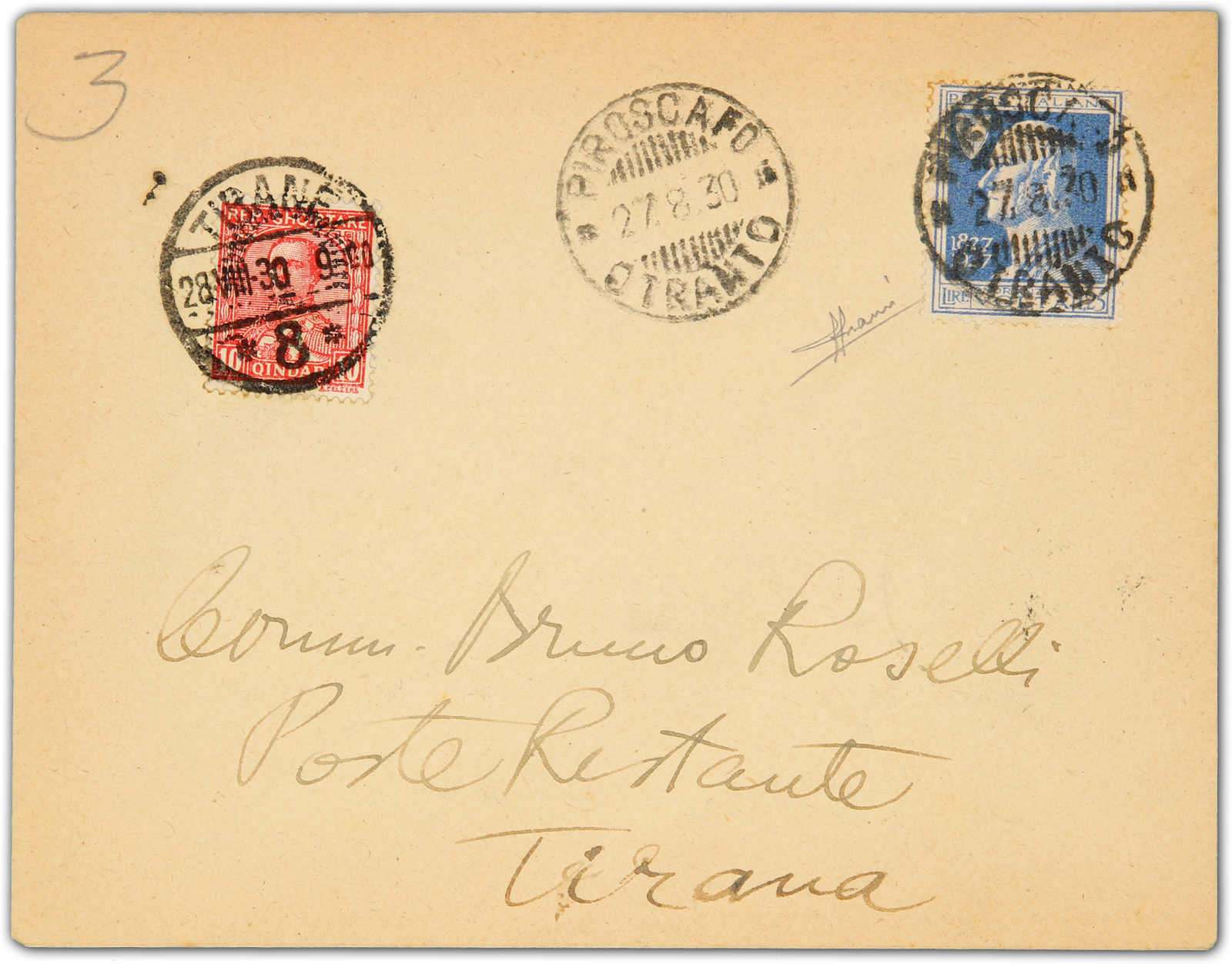 1930, poste restante cover sent from Italy by Volta 1.25 cent blue stamp tied by ship "PIRESCAFO/OTRANTO" cds to Tirane/Albania, the post restante fee collected by 10 qin, and tied by circular "TIRANE" cds, on reverse Durres transit and