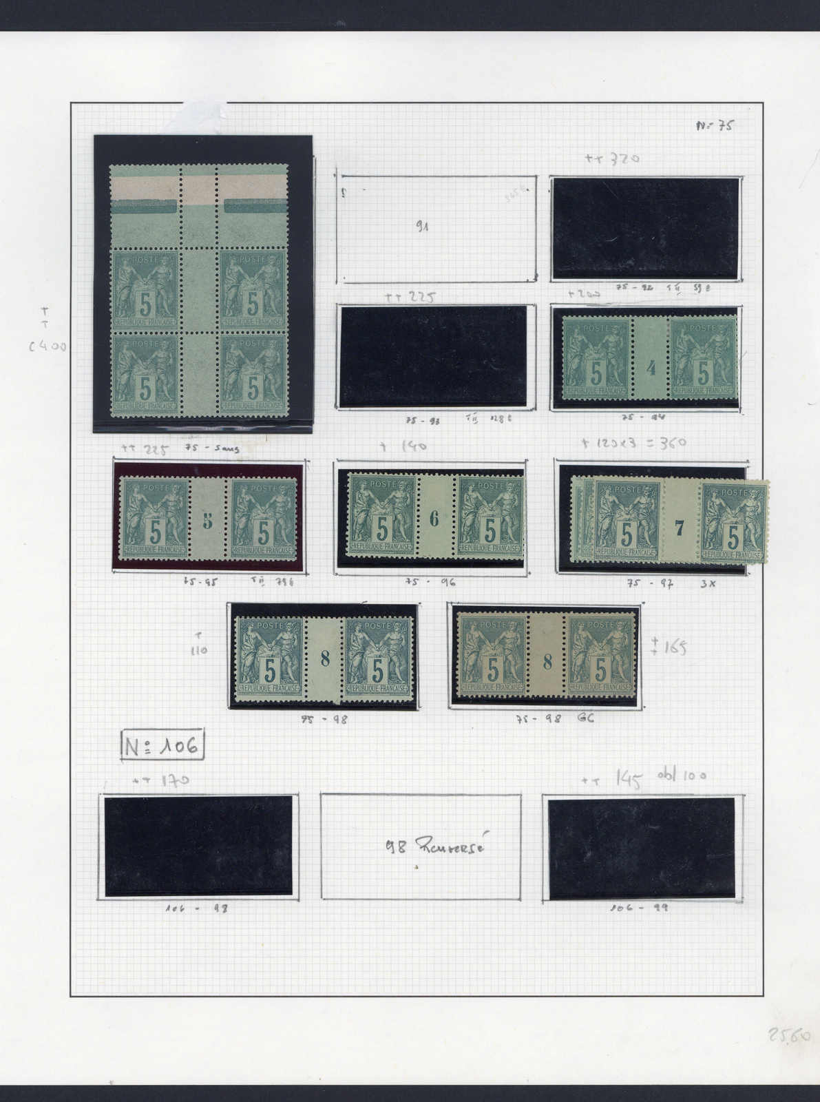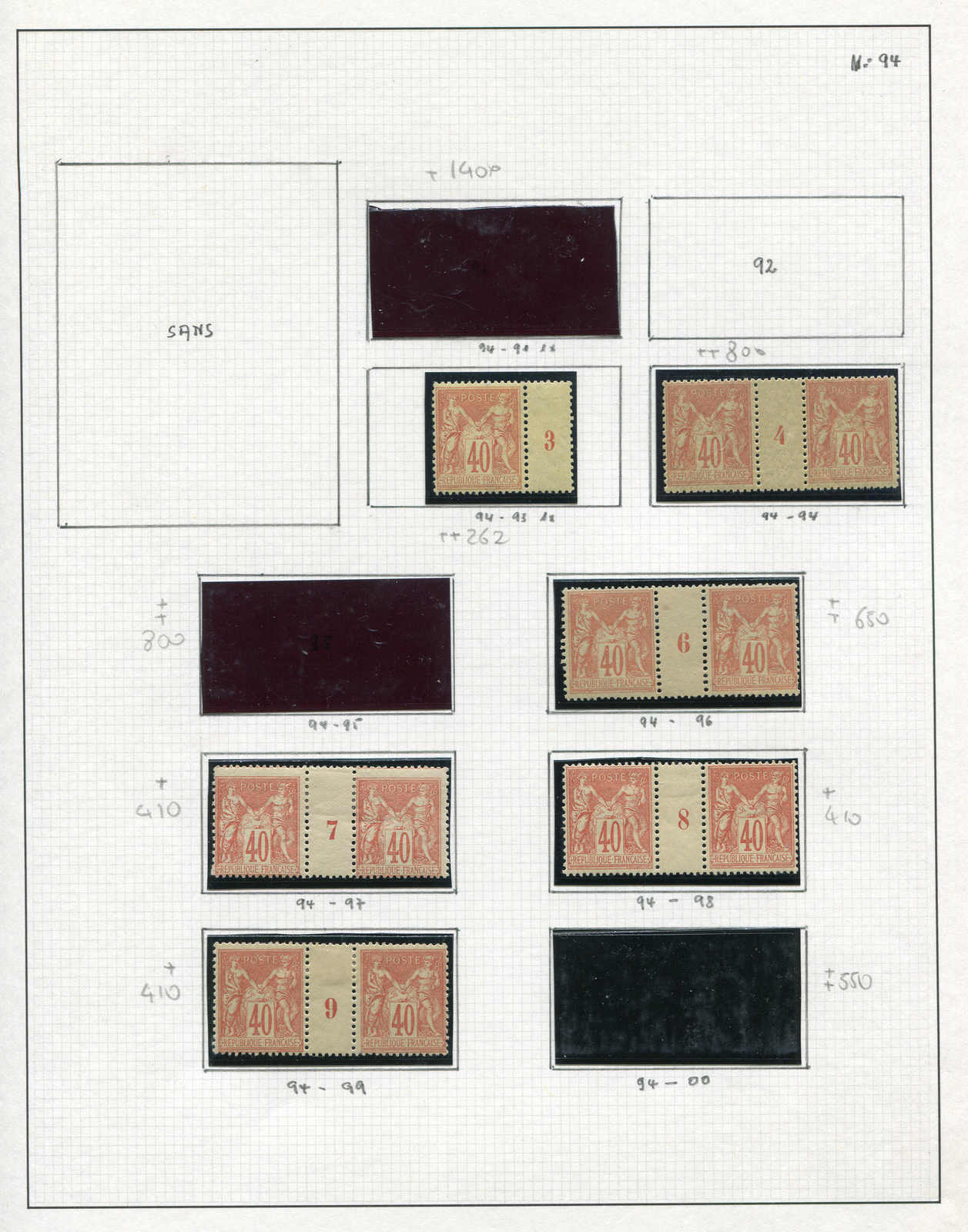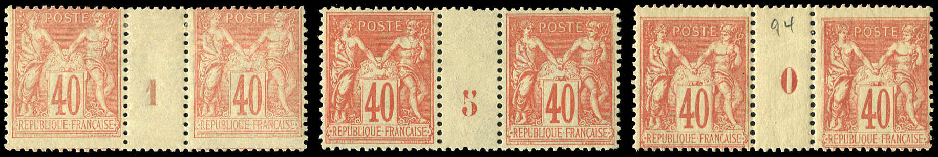 1881, 40 C. Type Sage II ziegelrot auf sämisch, Zwischenstegpaare mit Jahrgangs-Aufdruck auf dem Zwischensteg, Zusammenstellung von waagerechten postfrischen Zwischenstegpaaren der Jahrgänge 5 und 0, dazu ungebrauchte Paare der Jahrgänge