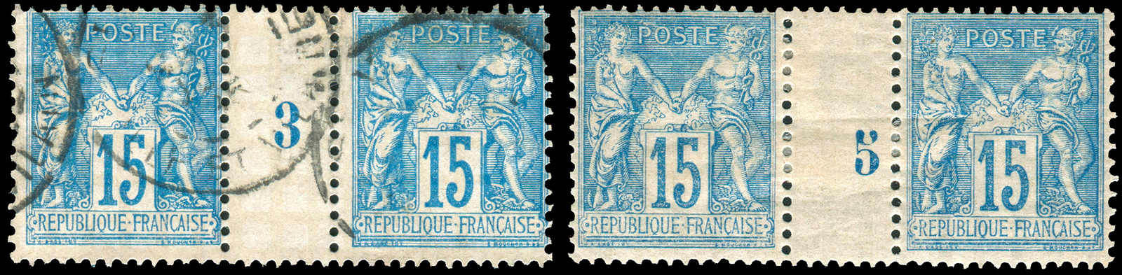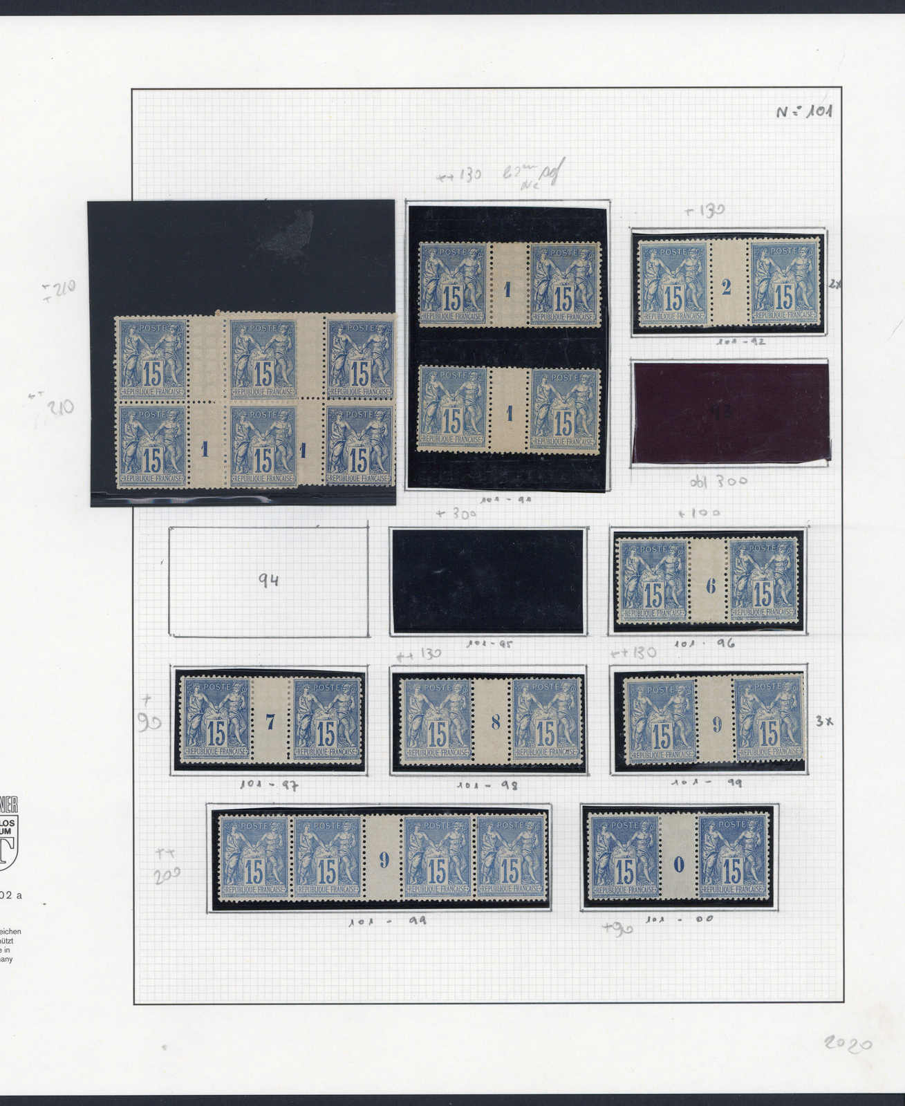 1892, 15 C. Type Sage II blau mit Kreideunterdruck, Zwischenstegpaare mit Jahrgangs-Aufdruck auf dem Zwischensteg, Zusammenstellung von zwei postfrischen Viererblocks Jahrgang 1 und postfrischen waagerechten Zwischenstegpaaren der