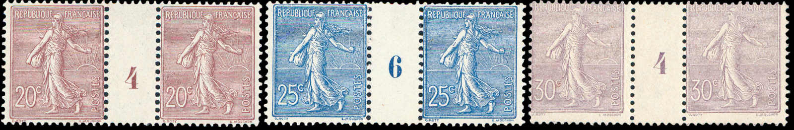 1903/24, 10 bis 30 C. Säerin mit schraffiertem Hintergrund, kompletter Satz in Zwischenstegpaaren mit Jahrgangsaufdruck mit allen gedruckten Jahrgängen pro Marke, dabei die 10 C. mit allen drei Typen, 1904 Type III und 1905 im