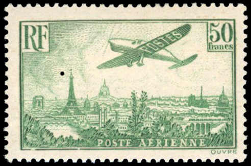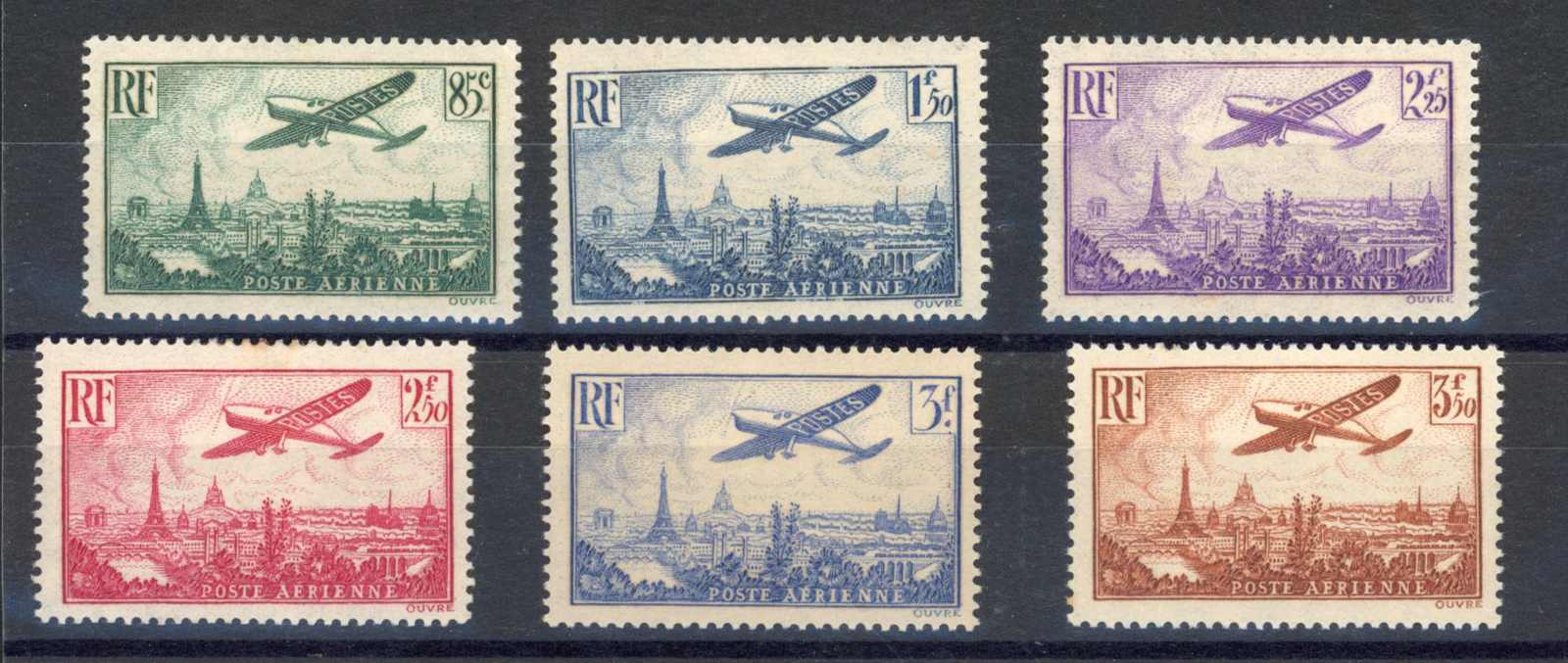 1936, 85 C. bis 50 Fr., Flugzeug über Paris, die kpl. Ausgabe von 7 ungebr. Werten, farbfrisch und gut gezähnt, 2,50 Fr. mit zwei gebräunten Zahnspitzen und der Wert zu 50 Fr. mit waager. Bugspur, sonst gute Qualität (ME ca. 900,-) (Image) (imagea)