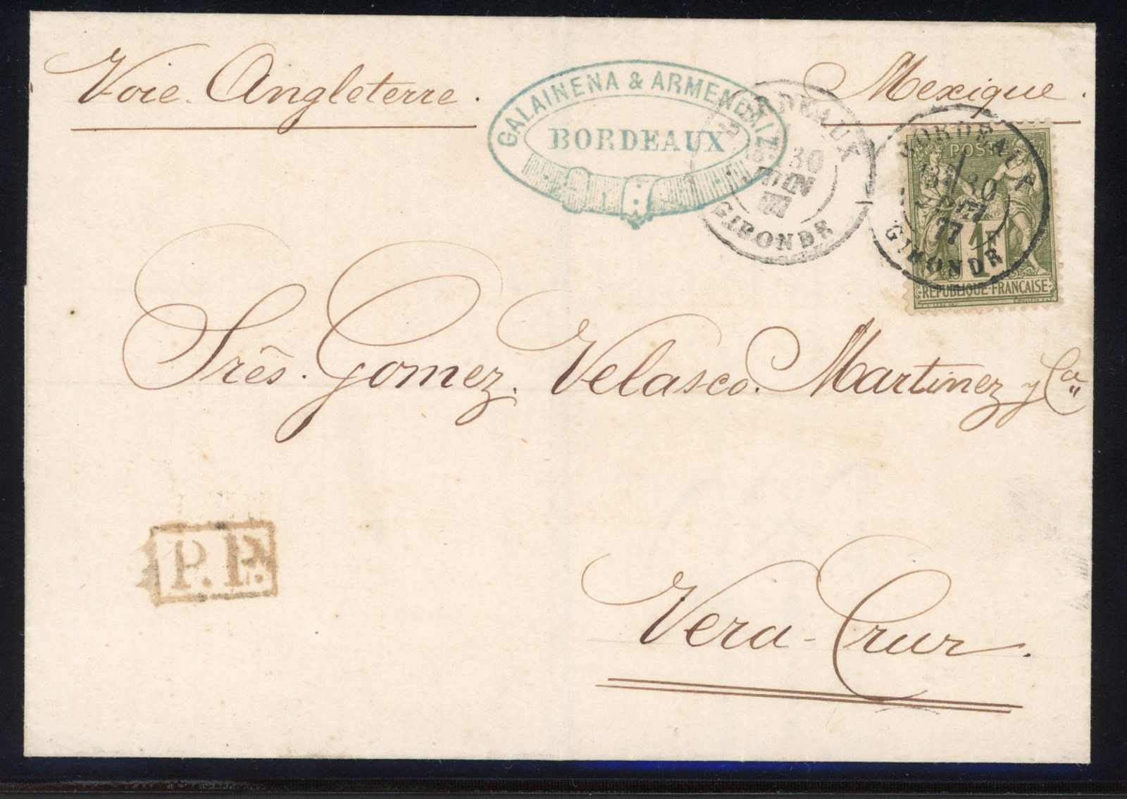 1877, 1 F. Allegorie oliv a. hellgelb als Einzelfrankatur auf Auslandsbrief (Faltbriefhülle), aufgegeben "BORDEAUX 31.8 77", adressiert nach Vera Cruz/Mexico, hsl. Leitvermerk "Voie Angleterre", leichte Faltungen waager. und senkr.