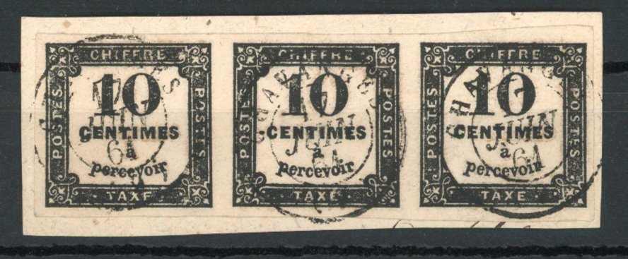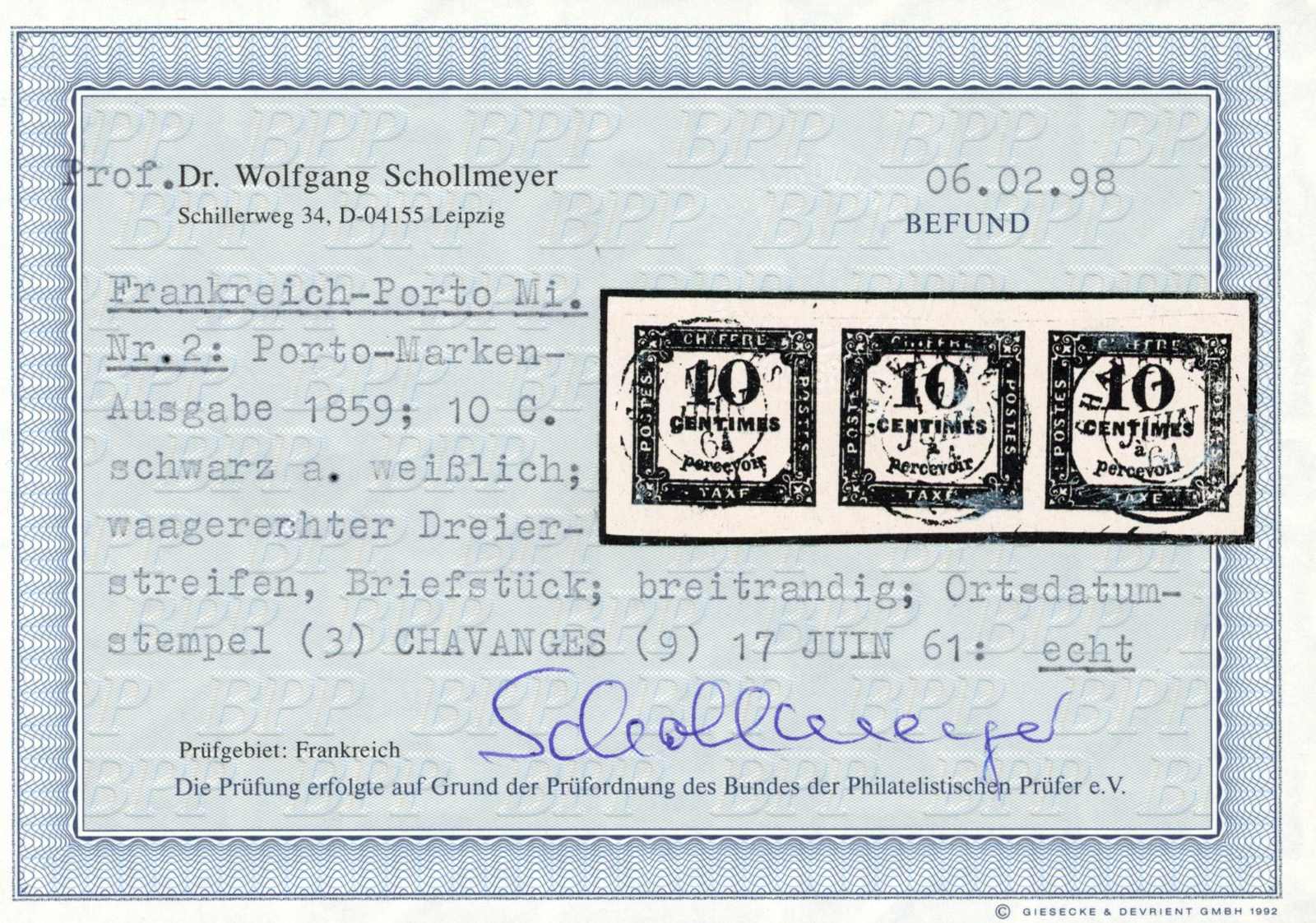 1859, 10 C. Ziffernzeichnung schwarz a. weiß, waager. 3er Streifen a. kl. Briefst., entwertet mit Ortsdatumsstp. "CHAVANGES 17. Juin 61", farbfrisch und breitrandig, Fotobefund Prof. Dr. Schollmeyer BPP "echt und einwandfrei", seltene