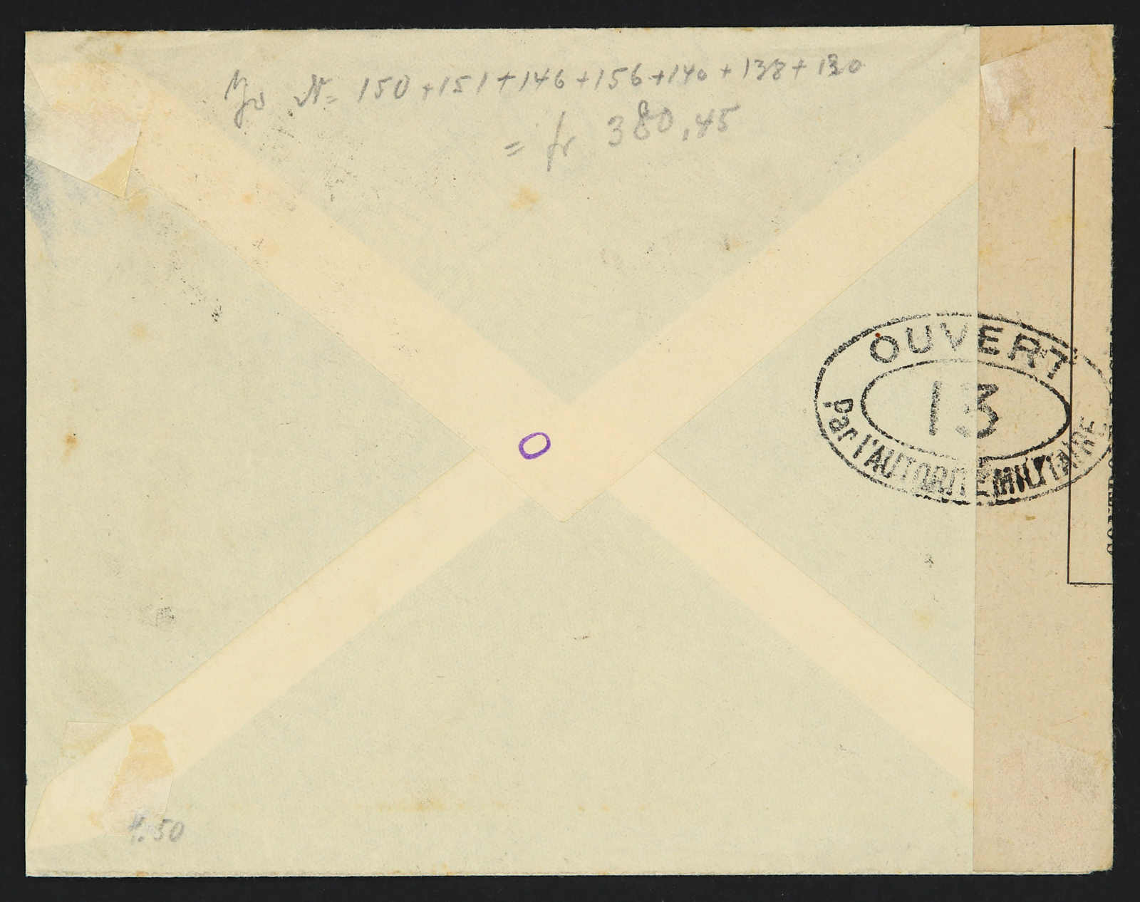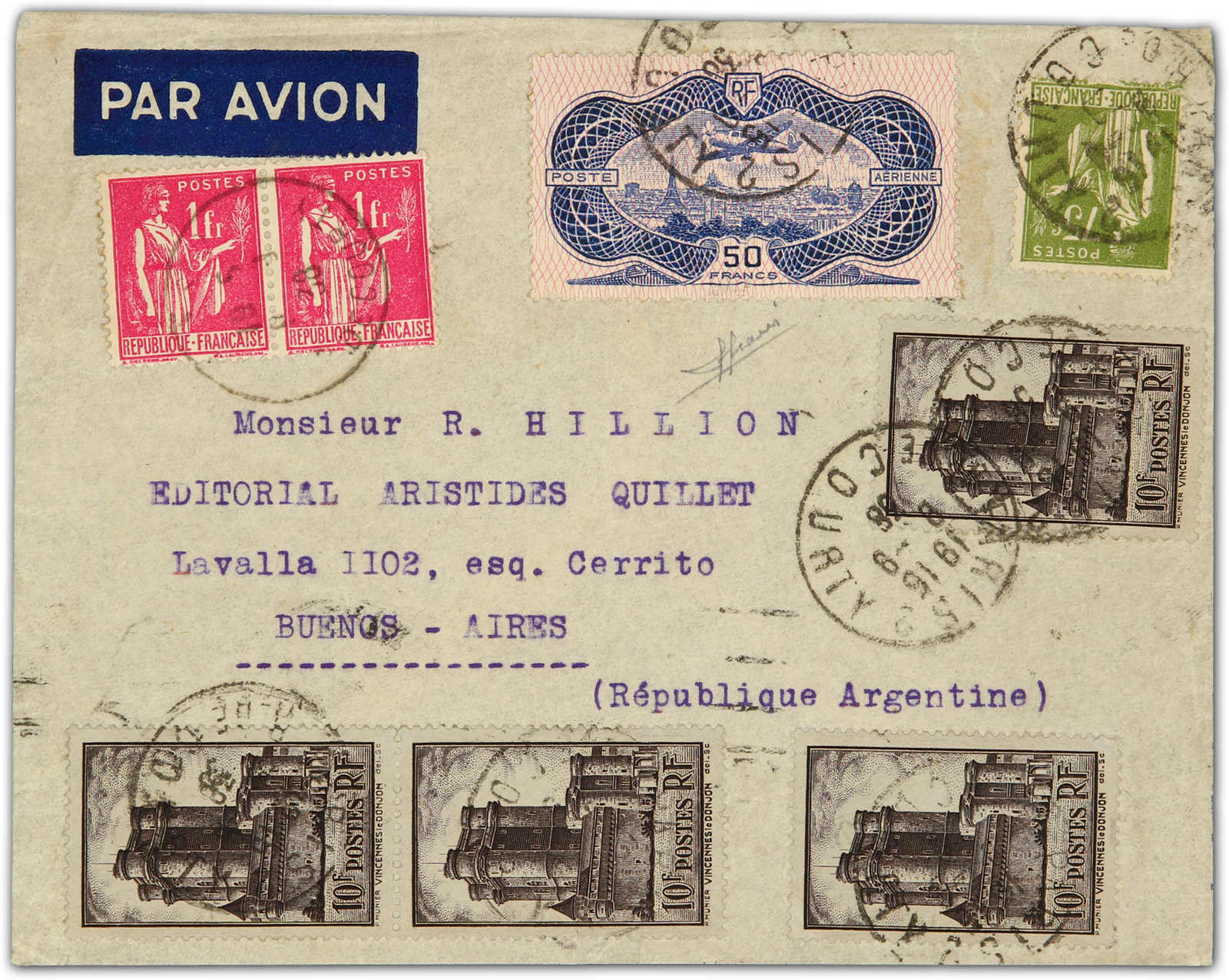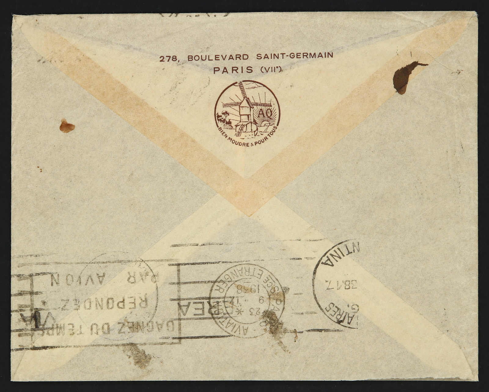 1938, Luftpostbrief von Paris nach Buenos Aires/Argentinien frankiert mit 50 Fr. Burelage, sauber entwertet "Paris 2" sowie anderen Werten, rückseitig Transit- und Ankunftsstempel (Image) (imagea)