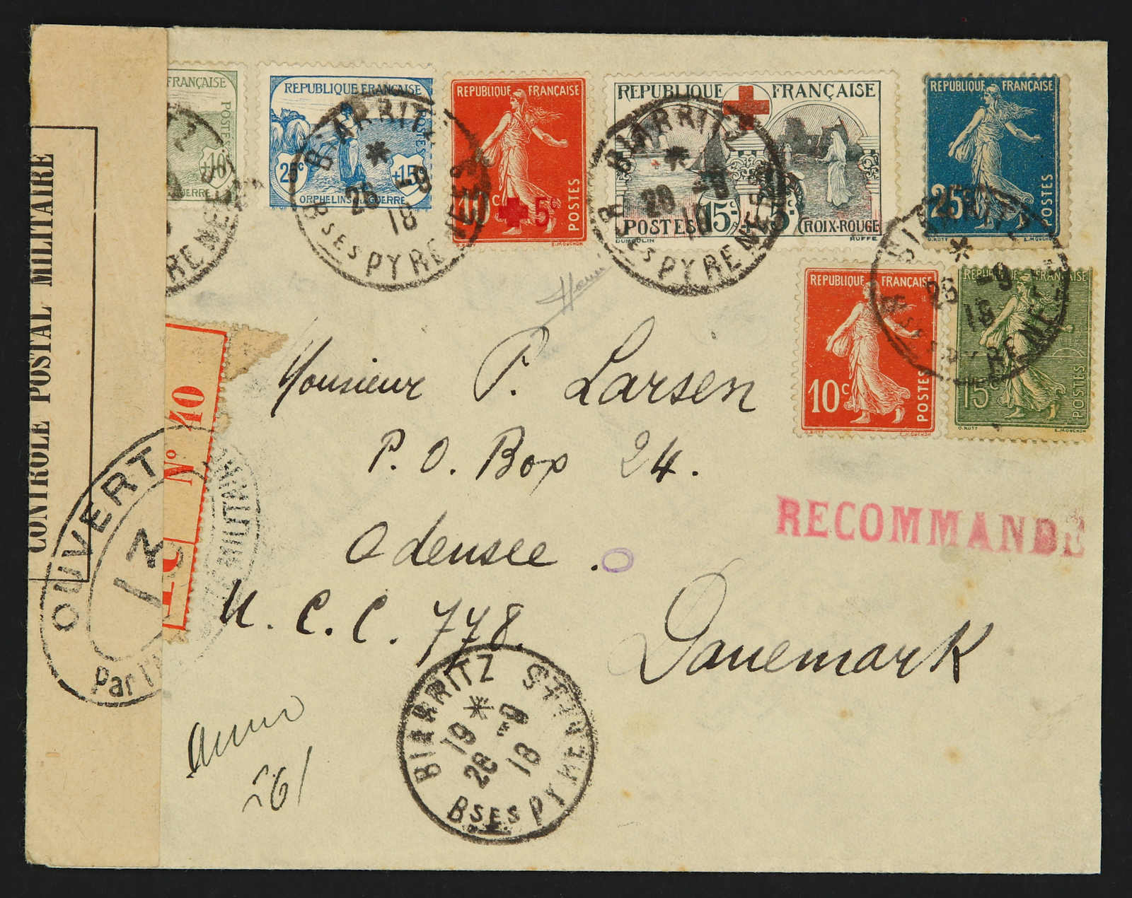 1918, R-Brief von Biarritz nach Dänemark frankiert mit 15 C. Rotes Kreuz und anderen Werten, Zensurzettel und -stempel (Image) (imagea)