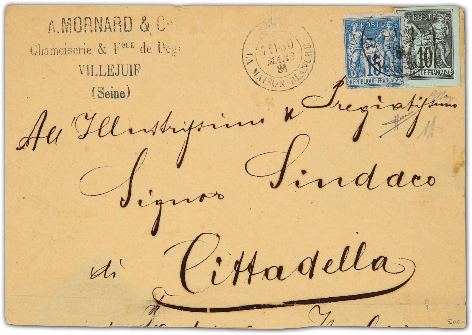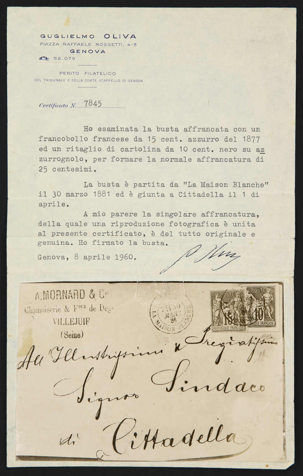 1881, Brief von Villejuif nach Cittadella/Italien frankiert mit 15 C. Allegorie und 10 C. Ganzsachenausschnitt entwertet durch "Paris La Maison Blanche", rückaeitig Ankunftsstempel, sehr seltene Verwendungsform, signiert Sorani, Attest