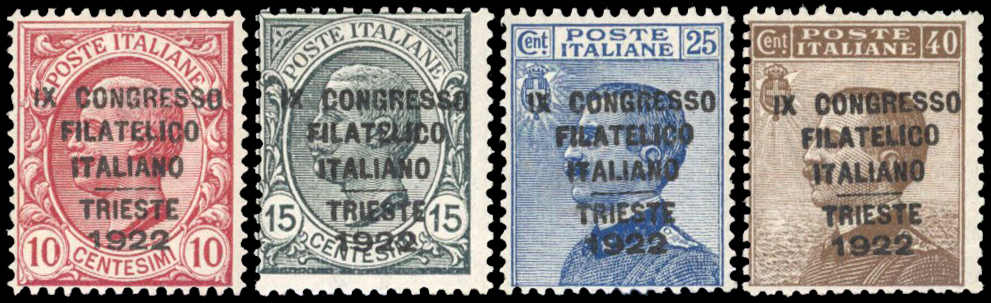 1922, 10 bis 40 C. 9. Kongress des italienischen Philatelistenverbandes, 4 postfr. Werte mit 5zeiligem schwarzen Aufdruck, die kpl. Ausgabe, farbfrisch und üblich gezähnt, einwandfrei, sign. (ME 1.800,-) (Image)