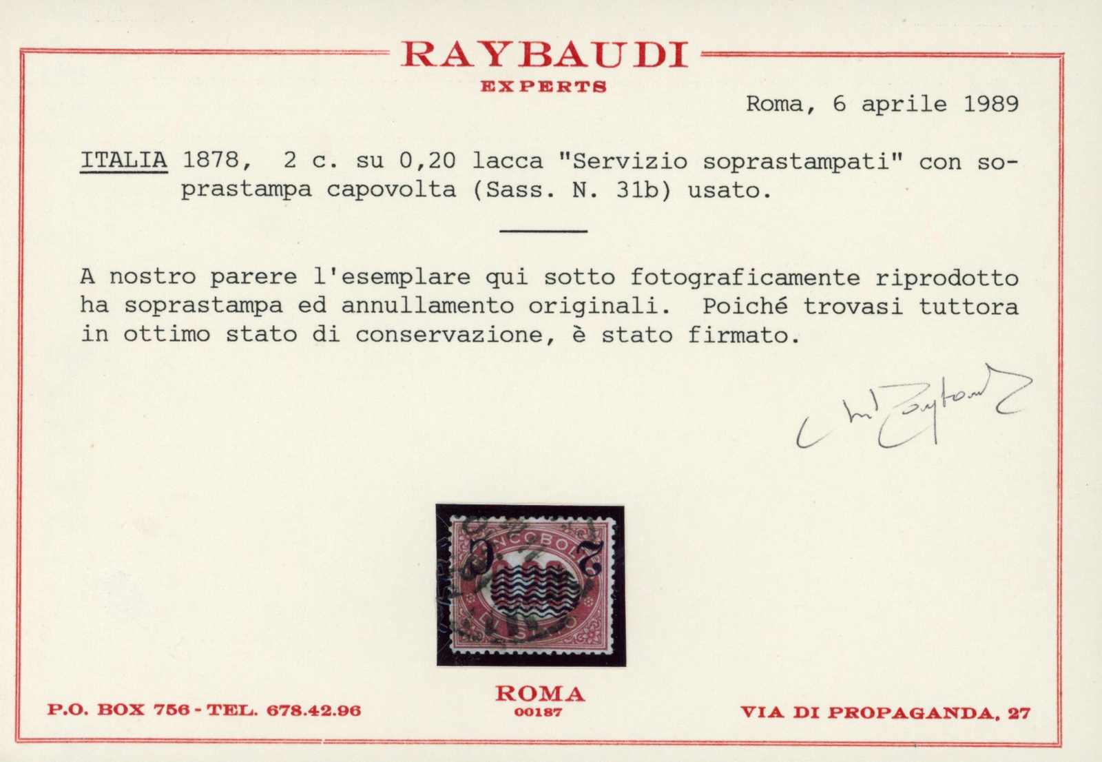 1878, 2 C. a. 0,20 L. dunkellilarot, Zeitungsmarke mit kopfstehendem blauen Aufdruck des neuen Wertes, gest. Einzelwert, farbfrisch und gut gezähnt, Fotoattest Raybaudi, im Michel nicht gelistet (nach Sassone 1.500,- Euro) (Image) (imagea)