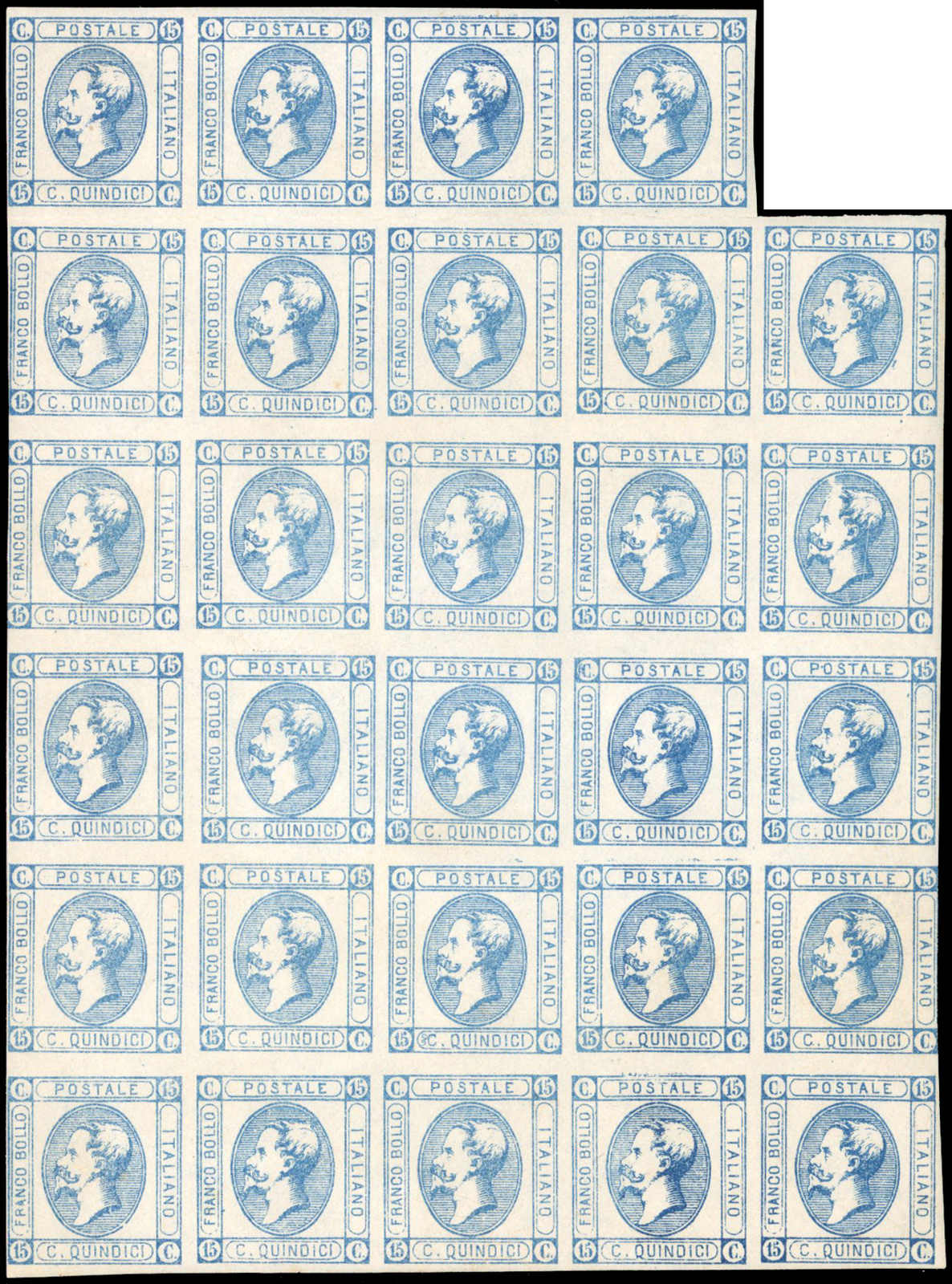 1863, 15 C. Viktor Emanuel, ungebrauchter 29er Bogenteil, dabei die 4te Marke in der 3. Reihe von oben in der Drucktype I "fast geschlossenes C vor QUINDICI", die übrigen Werte in der Drucktype II, farbfrische, teils etwas knapp