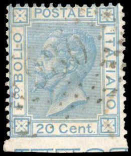 1867, 20 C. Viktor Emanuel II. hellblau gestempelt, unten ungezähnt mit Teil der Bogenrandinschrift, farbfrisch, rechts Zahnunregelmäßigkeiten und rückseitige Tönung, sign. A. D., im Michel nicht gelistet (nach Sassone ca. 2.000,-Euro) (Image)