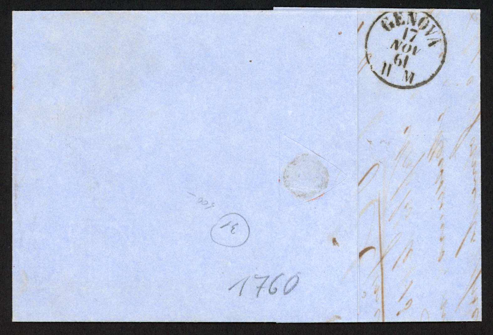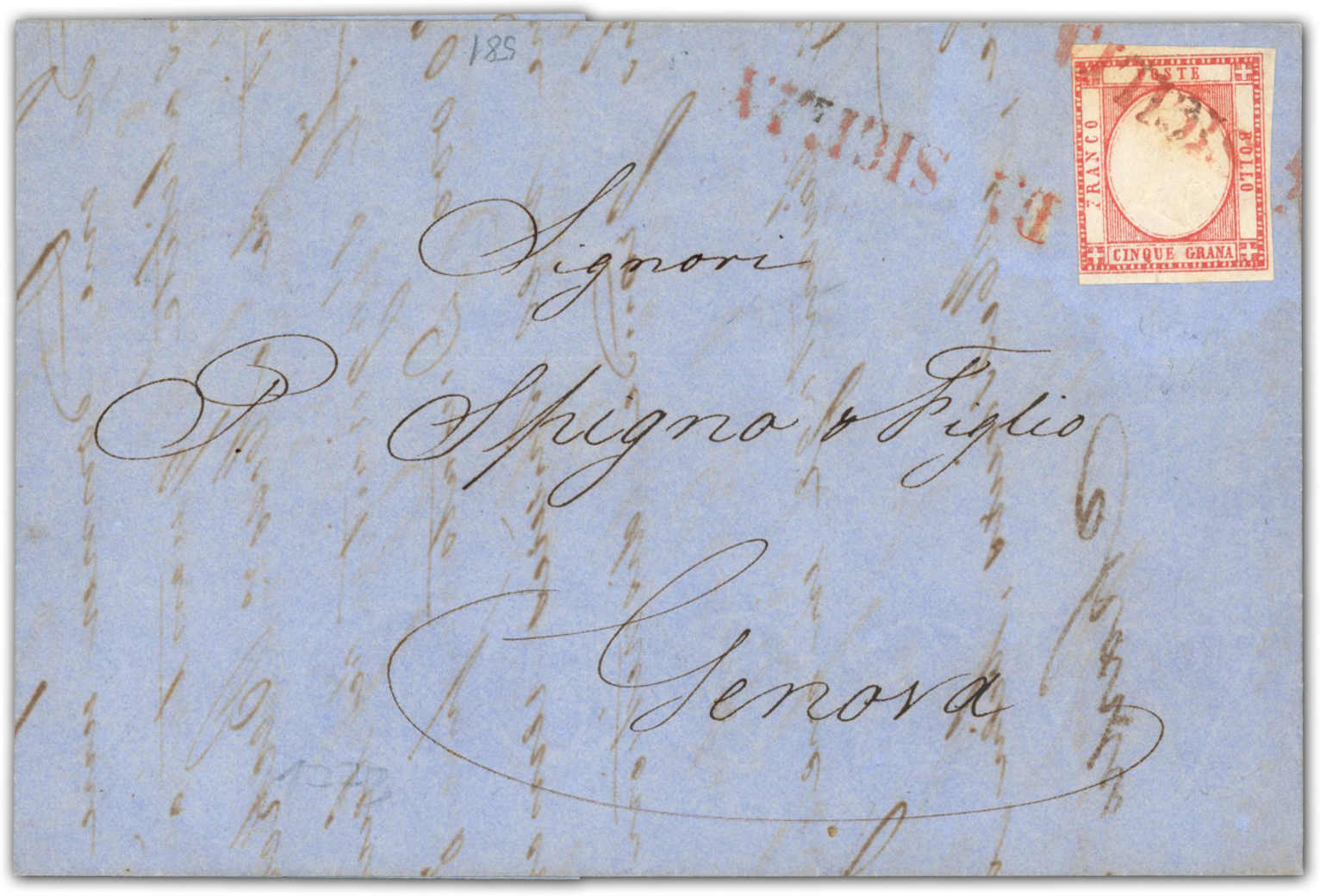 1861, 5 Gr. rot auf Brief aus Neapel nach Genua, entwertet und nochmals nebengesetzter L1 "DA SICILIA" in rot, Marke links berührt, sonst einwandfreier Beleg (Image) (imagea)