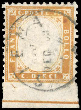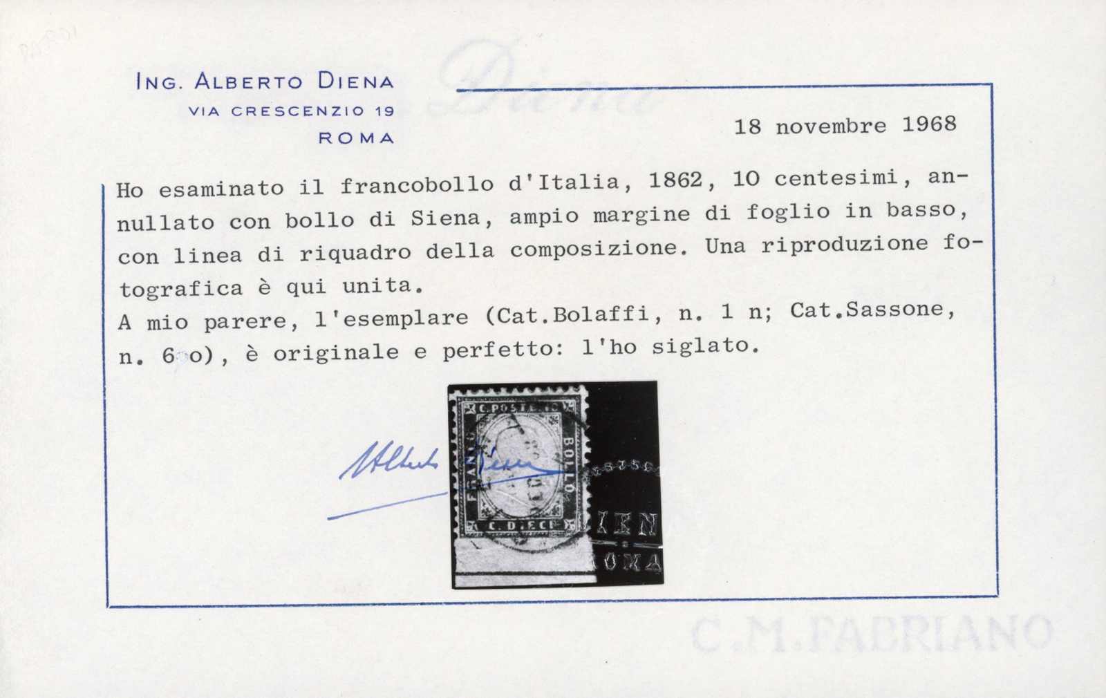 1851, 10c definitive, not perforated at bottom with large margin part incl. colour composition line, bent on bottom margin, considered first stamp of Italy, certificate Alberto Diena (Image) (imagea)