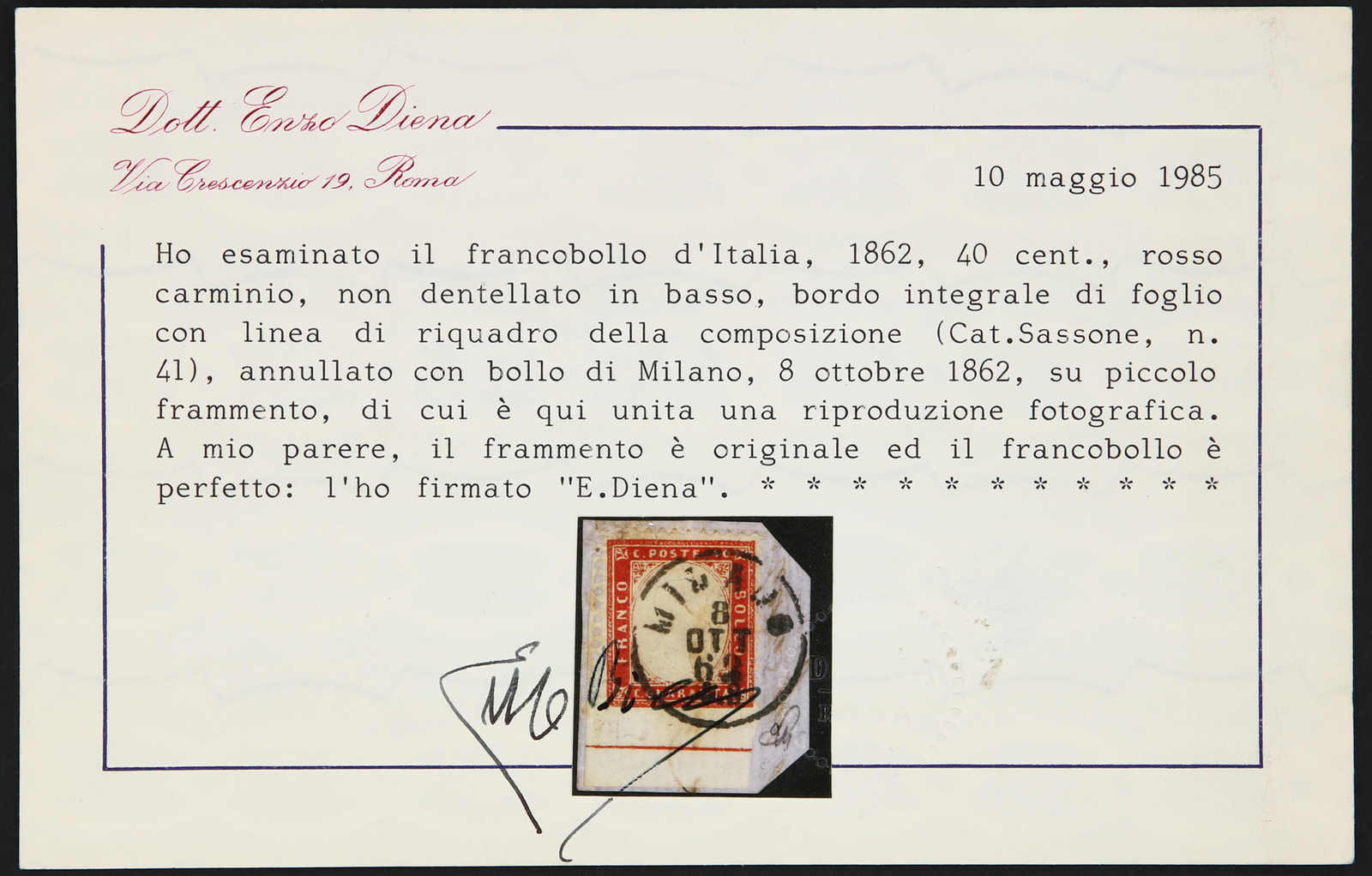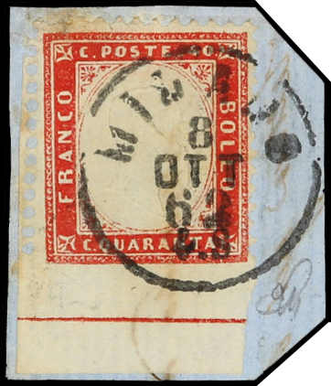 1861, 40c rose carmine, not perforated at bottom, with complete margin incl. colour composition line at bottom, neatly cancelled on piece, flawless, considered Italy first stamp, certificate Alberto Diena (Image) (imagea)