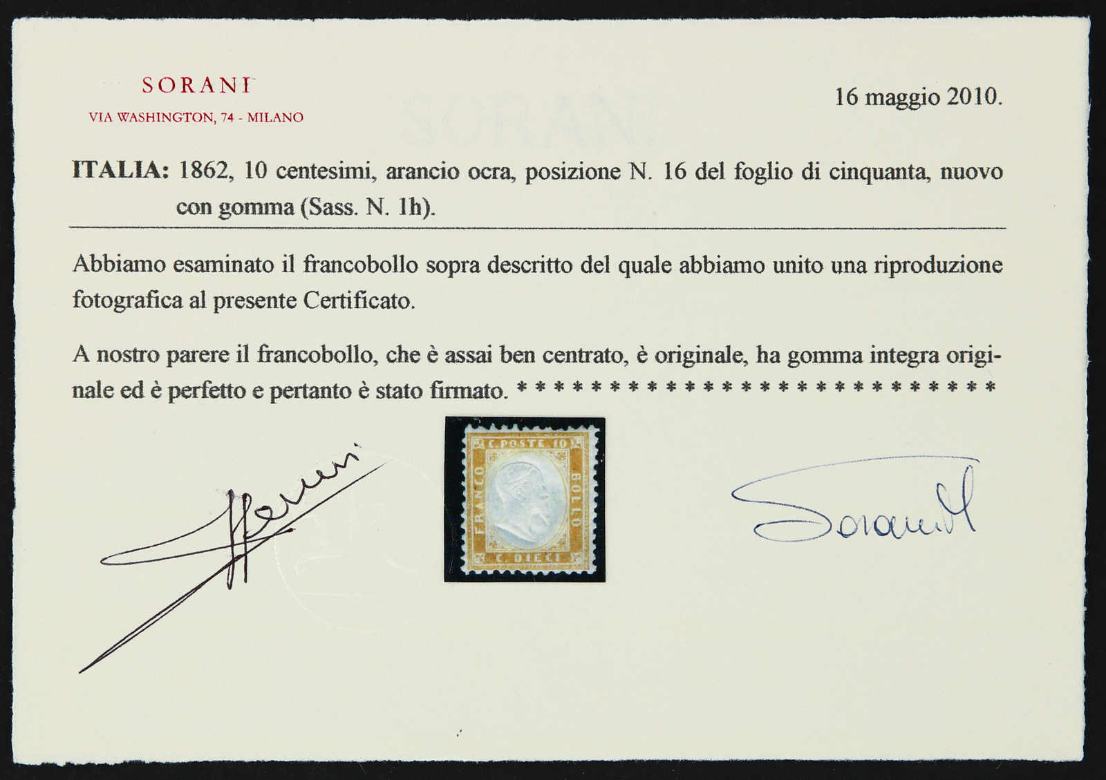 1862, 10 cen. orange-brown, position no. 16, unmounted mint with original gum, certificate S.Sorani, Sassone 18000 € (Image) (imagea)