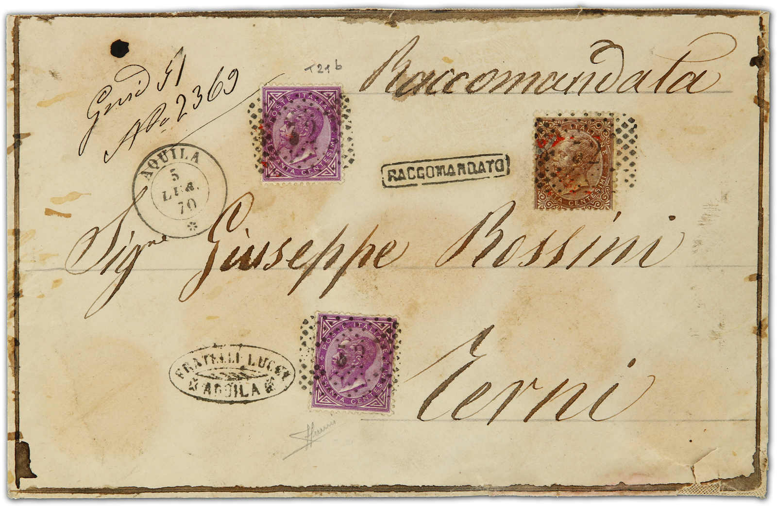 1870, registered two colour franking cover bearing 2x 60 cen. and 30 cen, Torino issue, used from Aquila to Termi, Sassone T19 and T21, signed Sorani