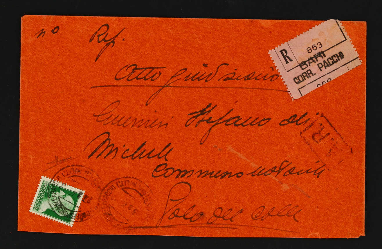 1929, regular postage high value 20 Lire single franking on A.R. Cover sent from Bari to Polo del Colle, Sassone 259, signed Sorani (Image)