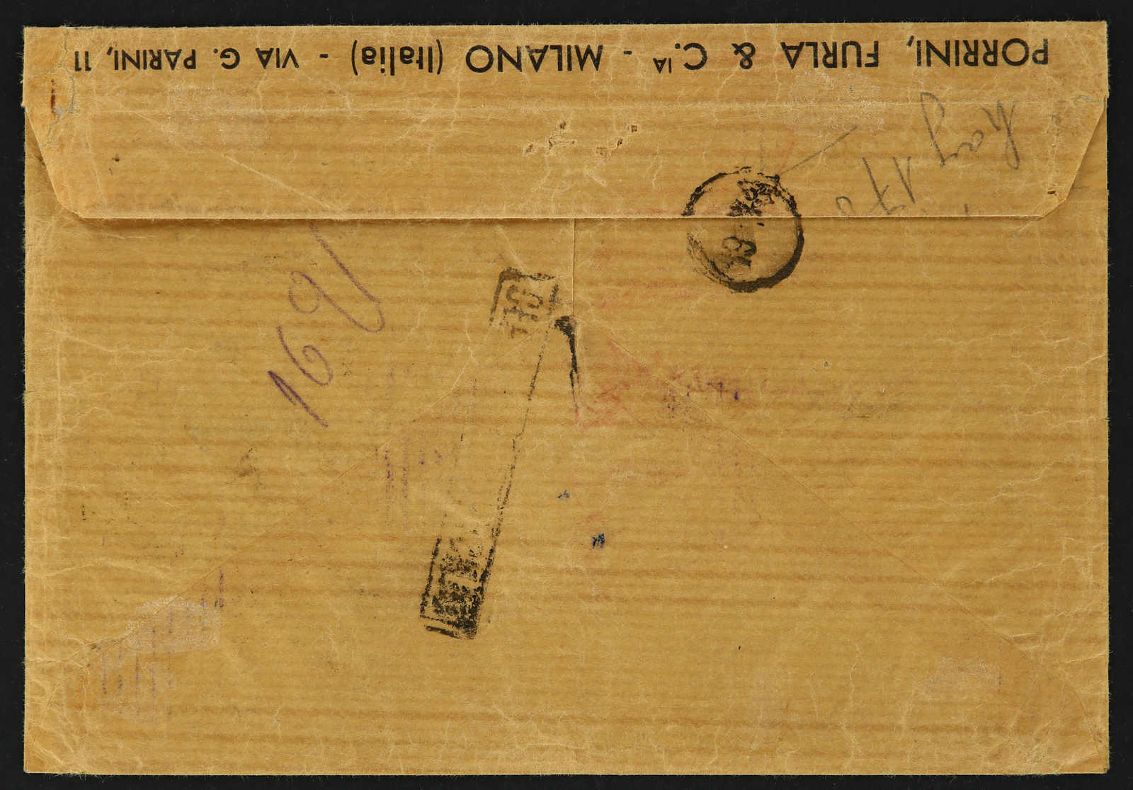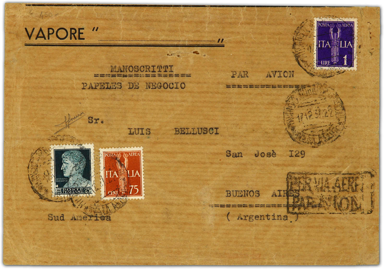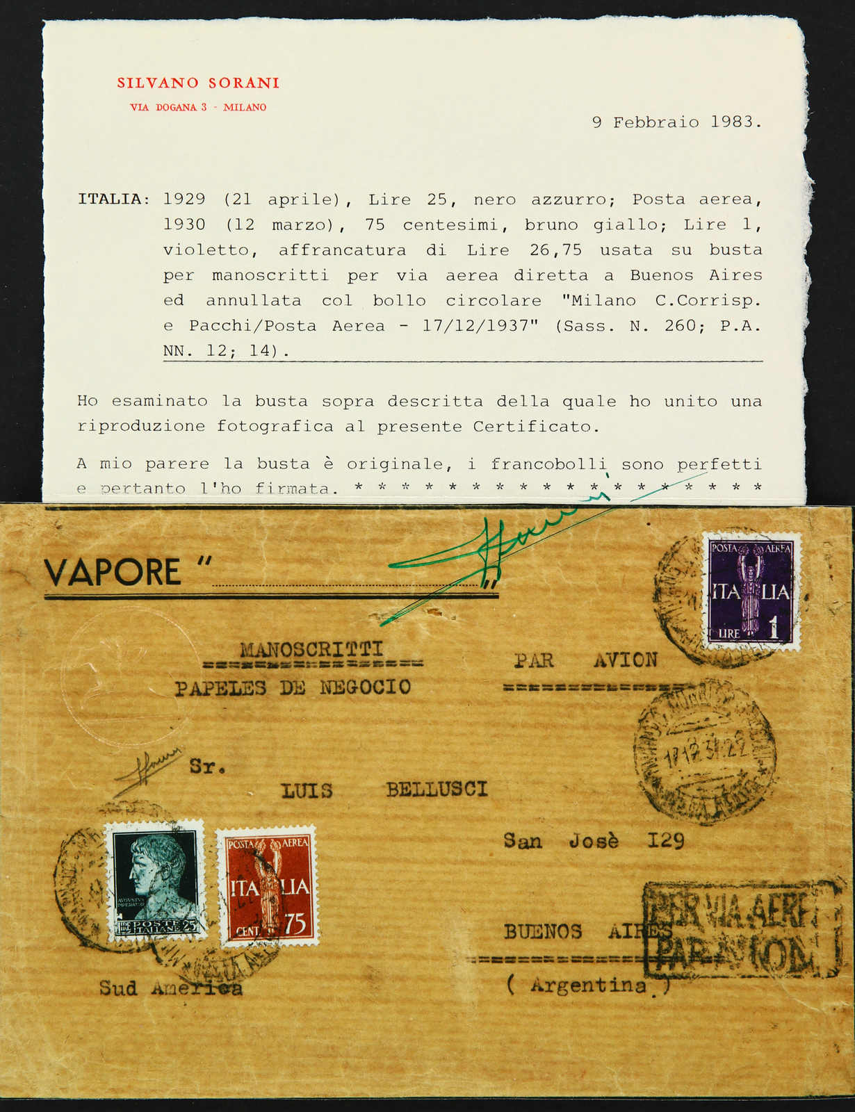 1937, airmail cover sent from Milano to Buenos Aires / Argentina bearing 1929 issue 25 Lire and 1930 airmail issue 75 cent and some issue 1 lire tied by "Milano C.Corrisp,e Pacchi/Posta Aerea 17/12/1937" cds., Sassone 260, P.A. 12 and 14,