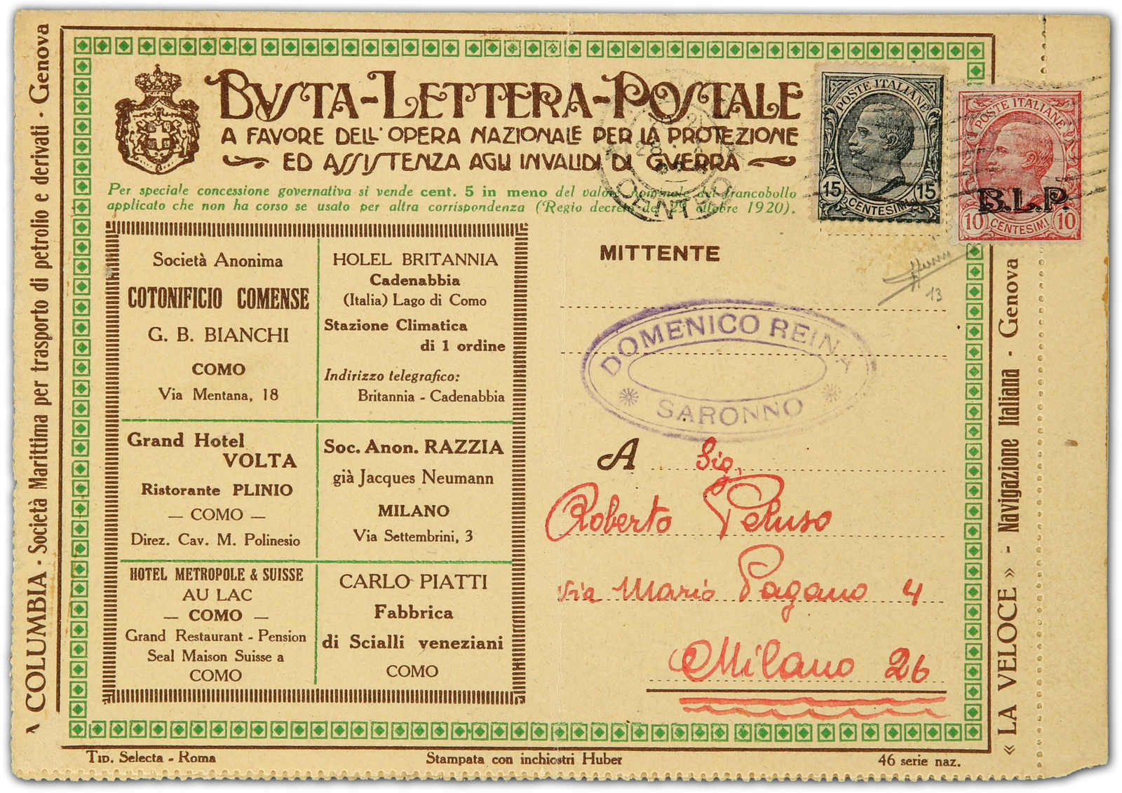 1923, special card letter with advertisement In favour of national work for the protection and support of war invalids used with B.L.P. overprinted stamp sent to Milano, Sassone 13 BLP, cat. 1400 €, signed Sorani (Image) (imagea)