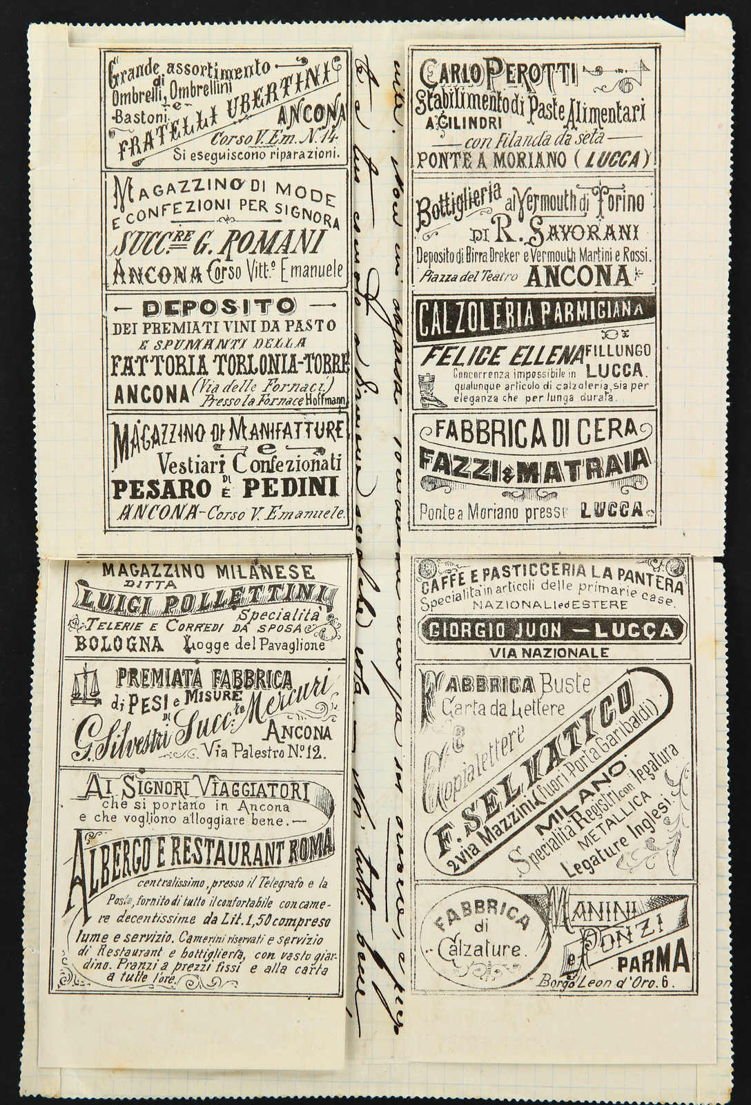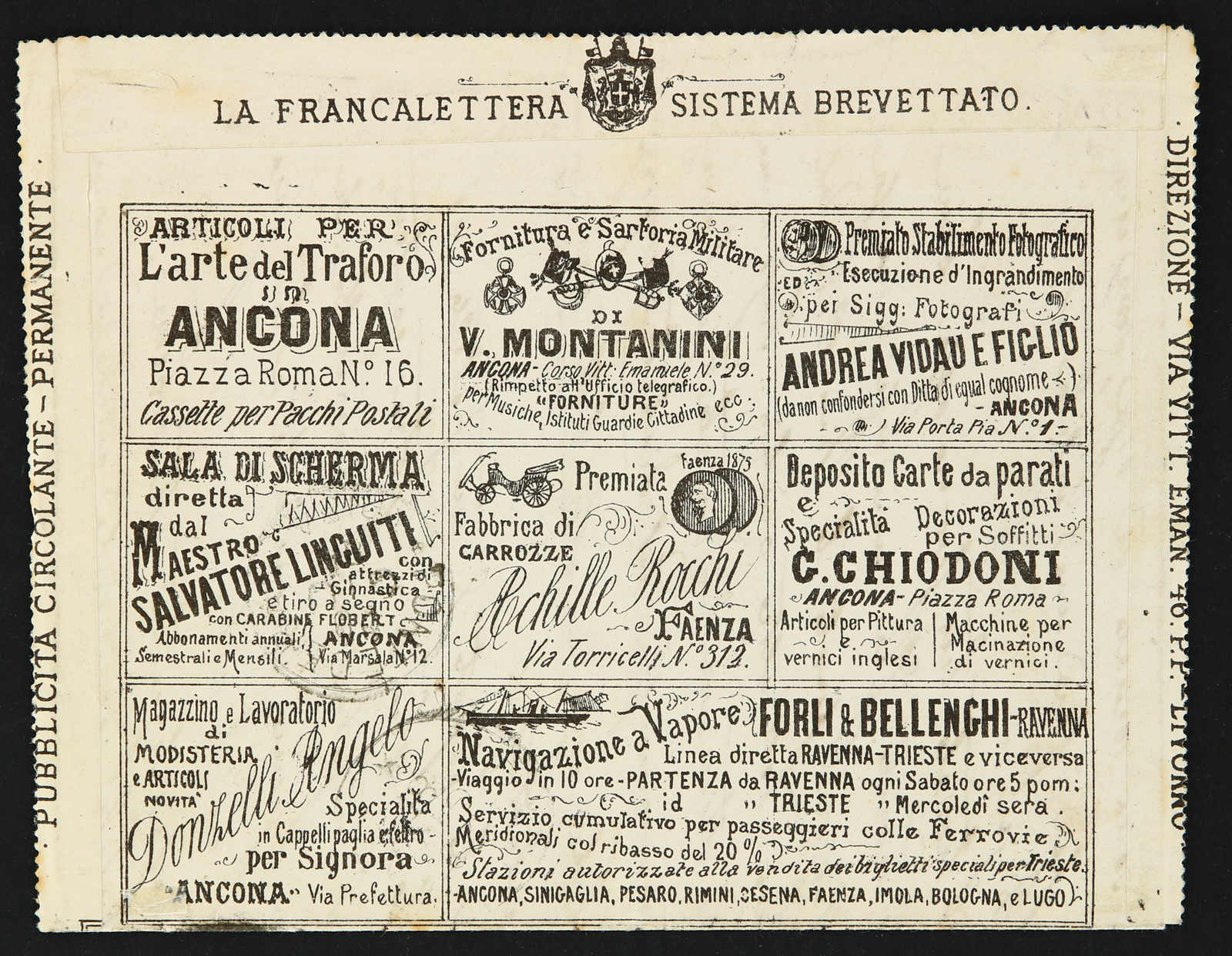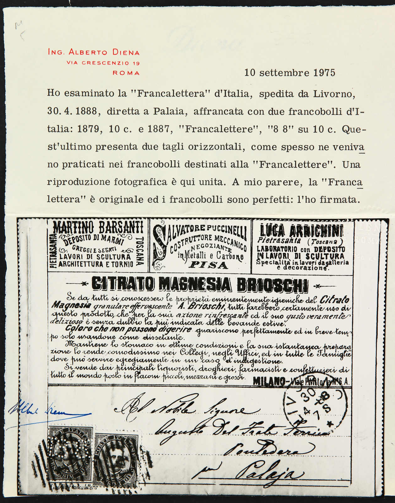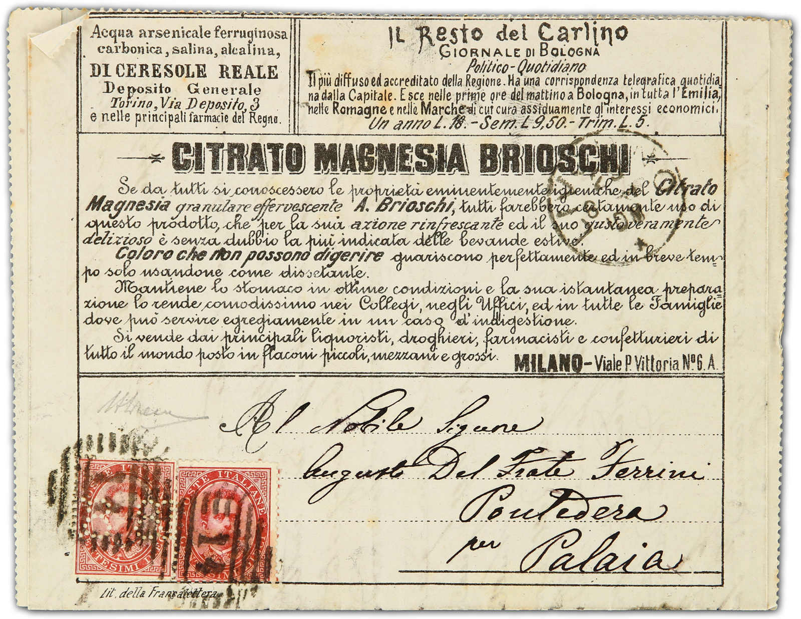 1890, special card letter with advertisement "Franca lettera" used from Livorno to Palaia bearing 1879 issue 10 c. and same stamp with perforation of "88" tied by numeral postmarks of "14", extremely rare, Sassone 3, cat. 28000 €,